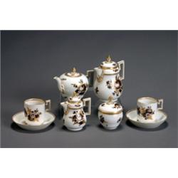 Consisting of a coffeepot, a teapot, a covered sugar bowl, a covered cream jug, six cups and six saucers. Each decorated with floral sprays in shades of gray-brown with pink and gilt highlights. Each with underglaze blue crossed swords and star mark; five pieces with underglaze blue 4; four saucers with underglaze blue B1. 16 pieces. Small chips to spout of teapot; some wear to gilt edges.
