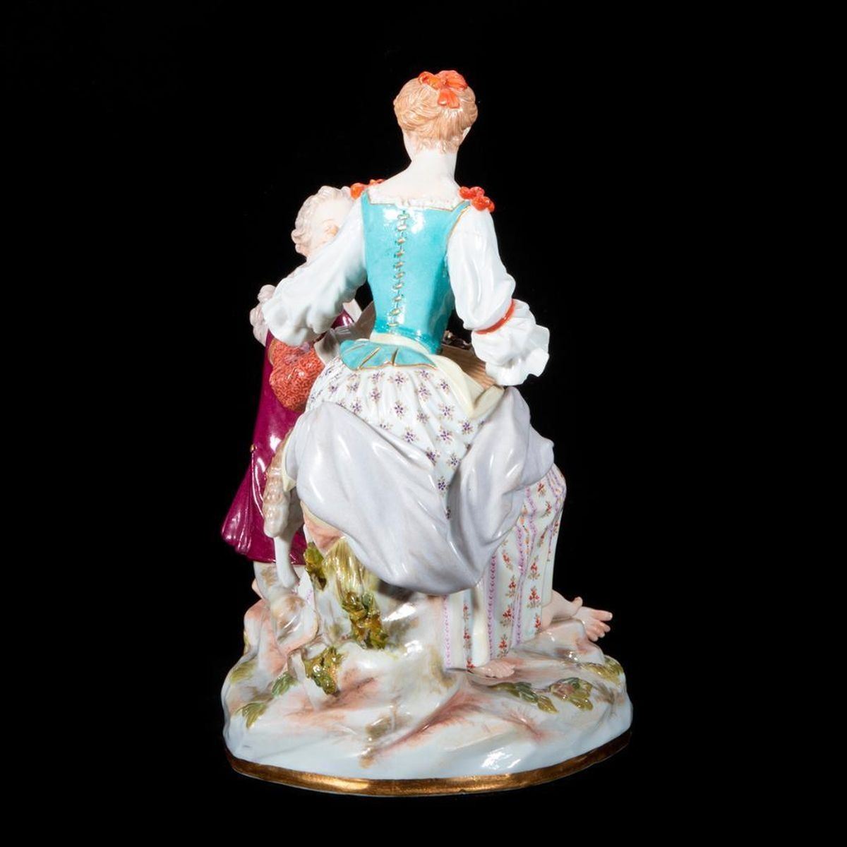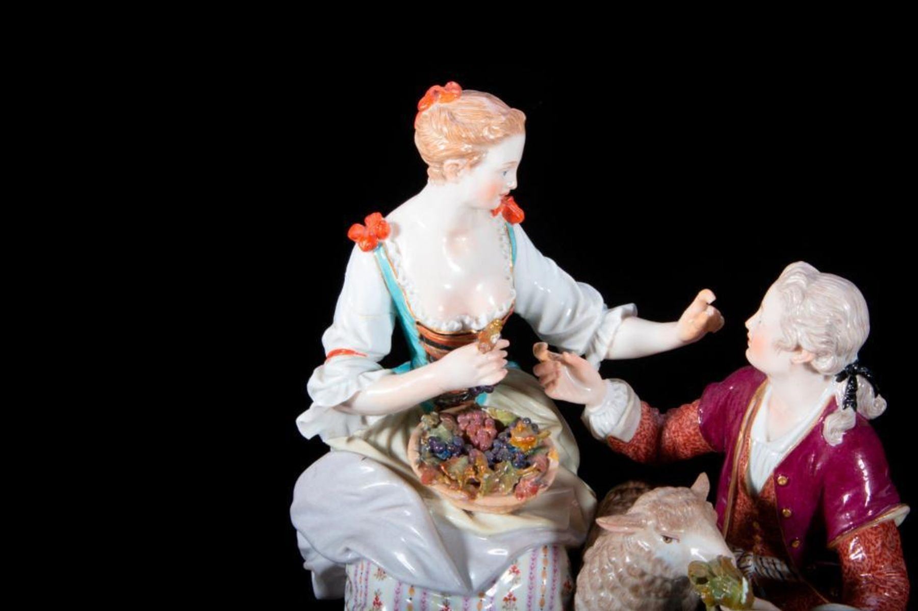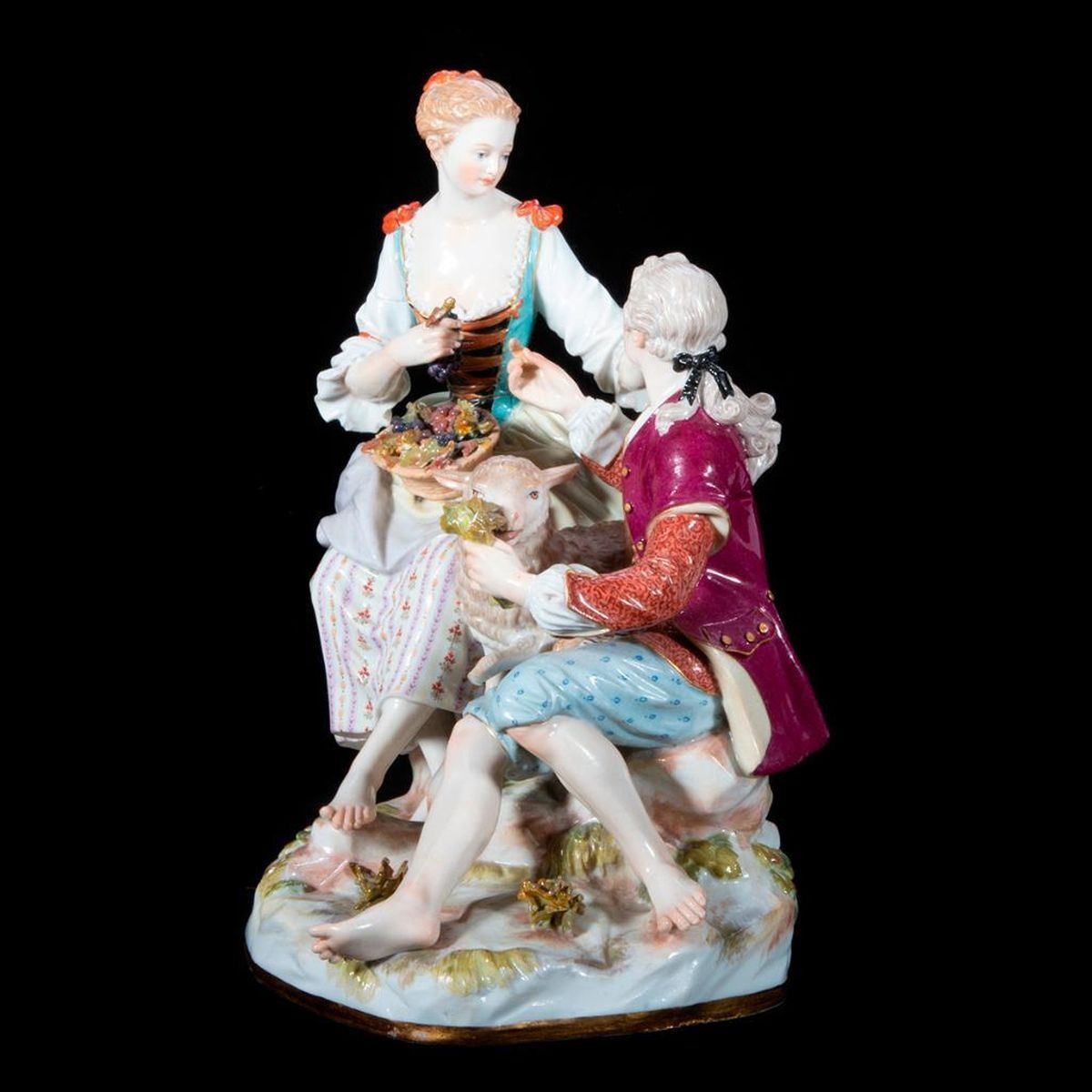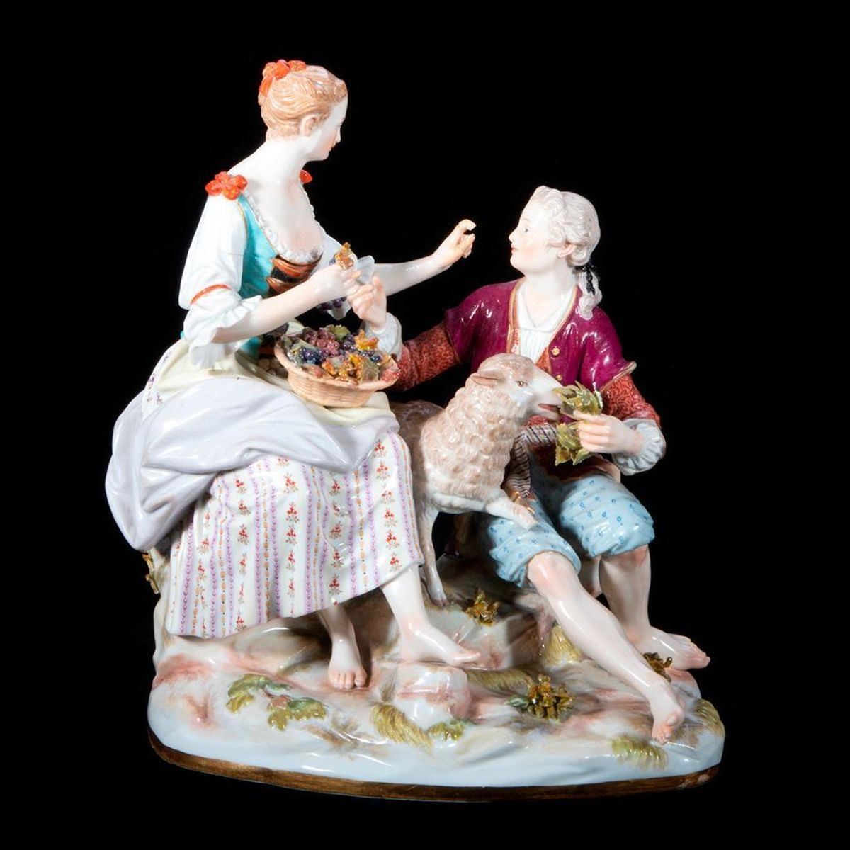 Meissen Group of Woman, Man and a Sheep. Dimensions: H-7.5", W-6.5", D-4.5" Condition: Sheep has broken leg.