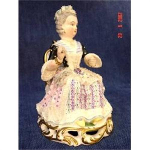 Meissen Figurine of a Lady Sitting on a Chair Sewing Crossed Swords Mark to Base A/F c1790.