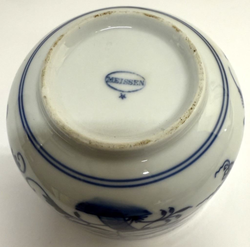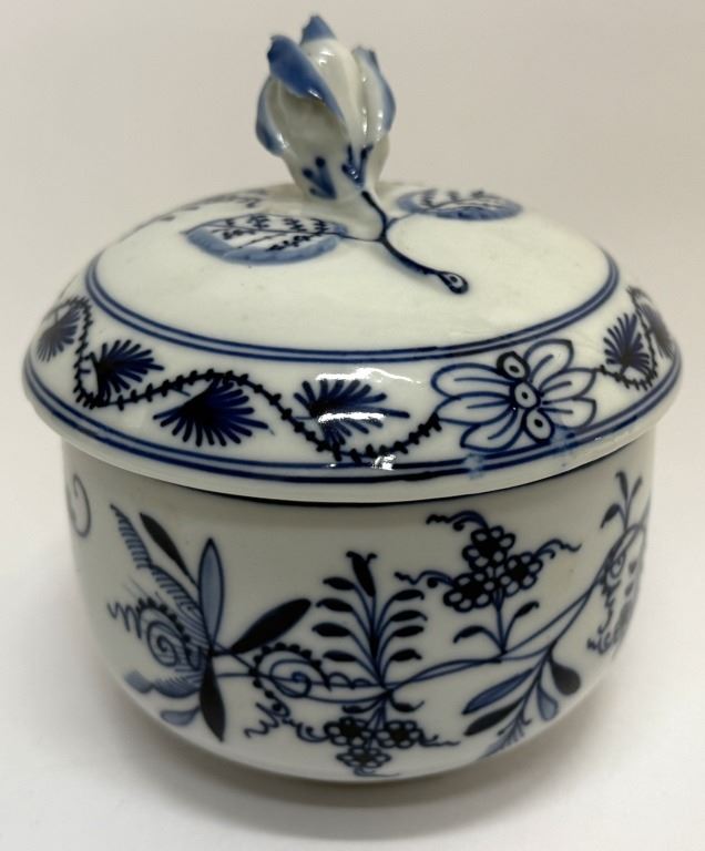 Item/Description: Featuring a Meissen blue and white porcelain sugar bowl jar with an onion / flower bud lid and floral motifs.