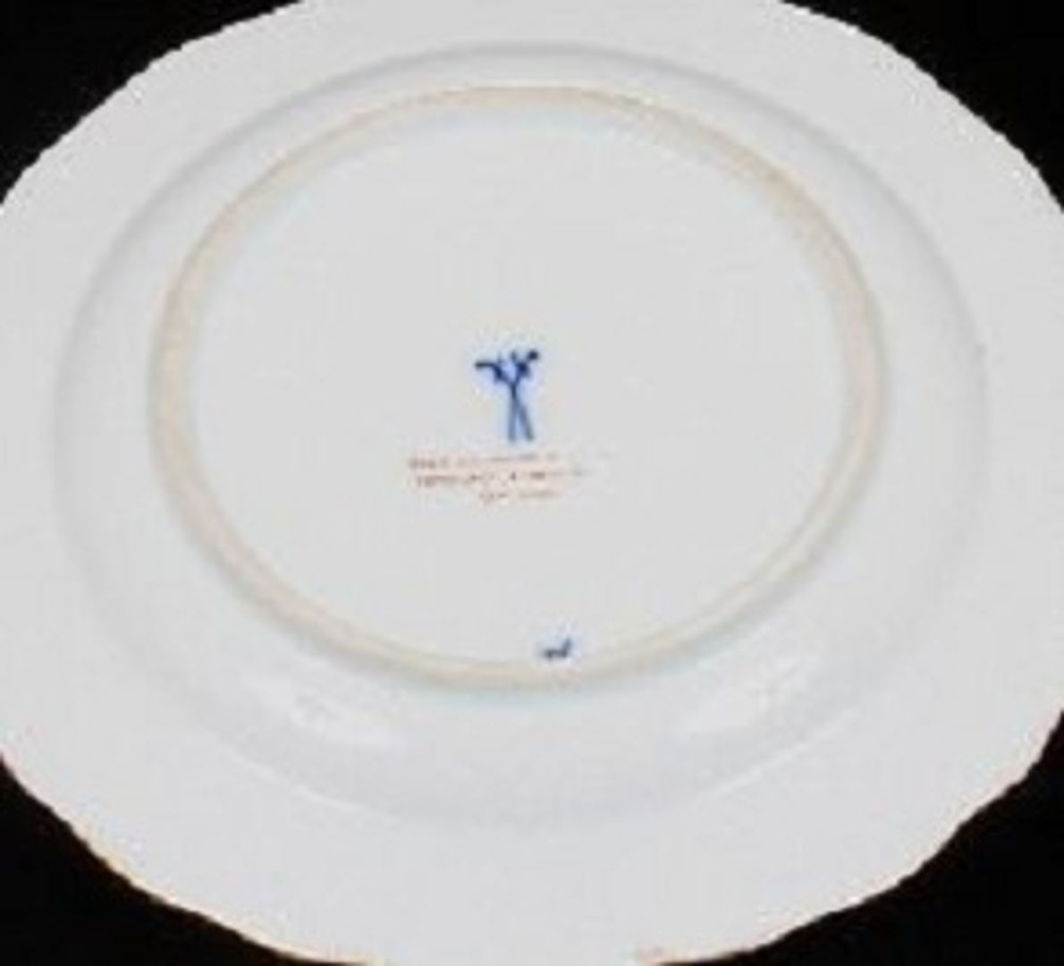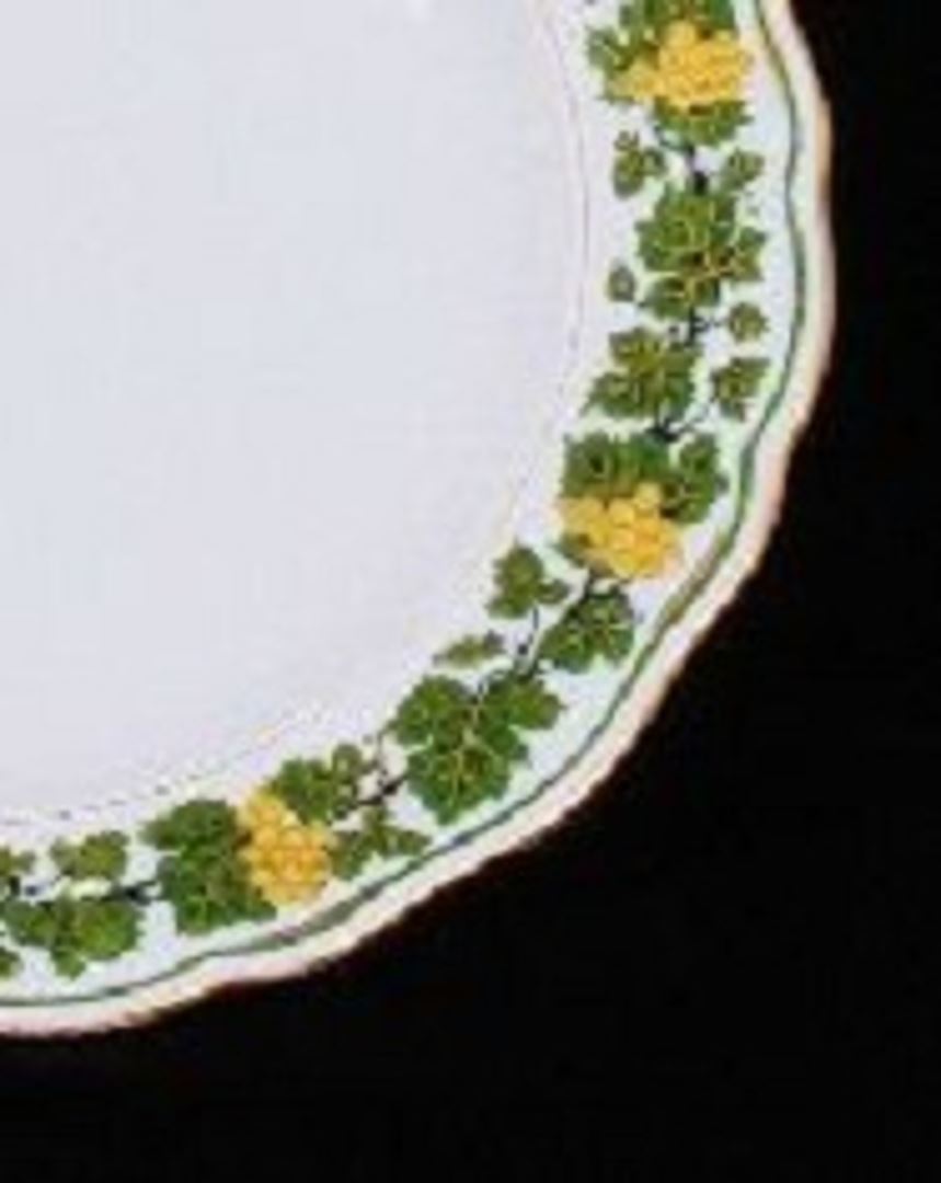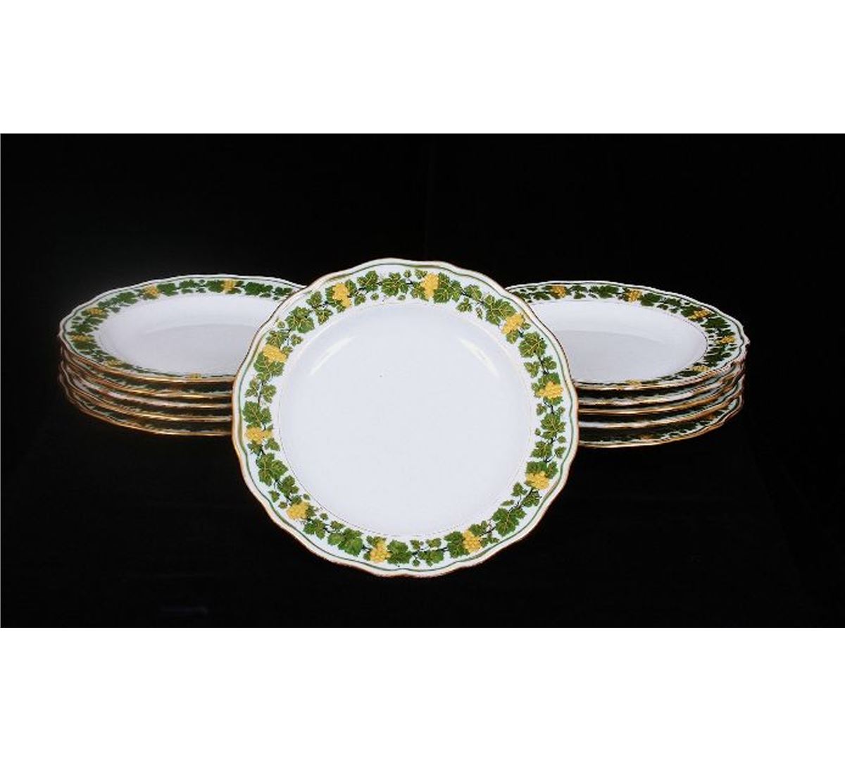 One set of eleven porcelain 8 inch plates made by Meissen. This set is in the Garland of Grape leaves pattern by Miessen. The ruffled rim of each bowl is completely hand painted with deep green grape leaves and gilt bunches of grapes. The underside of each piece is marked with the Meissen crossed swords hallmark. None of the hallmarks have cancellation marks. each piece is also marked with the retailer's mark for Davis Collamore and Co Ltd. This set was probably made in the first quarter of the 1900s. This set is in fabulous overall condition. There is minimal wear to the painted designs. There are no flaws and no repairs.