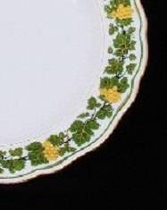One set of eleven porcelain 8 inch plates made by Meissen. This set is in the Garland of Grape leaves pattern by Miessen. The ruffled rim of each bowl is completely hand painted with deep green grape leaves and gilt bunches of grapes. The underside of each piece is marked with the Meissen crossed swords hallmark. None of the hallmarks have cancellation marks. each piece is also marked with the retailer's mark for Davis Collamore and Co Ltd. This set was probably made in the first quarter of the 1900s. This set is in fabulous overall condition. There is minimal wear to the painted designs. There are no flaws and no repairs.