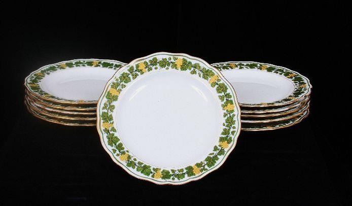 One set of eleven porcelain 8 inch plates made by Meissen. This set is in the Garland of Grape leaves pattern by Miessen. The ruffled rim of each bowl is completely hand painted with deep green grape leaves and gilt bunches of grapes. The underside of each piece is marked with the Meissen crossed swords hallmark. None of the hallmarks have cancellation marks. each piece is also marked with the retailer's mark for Davis Collamore and Co Ltd. This set was probably made in the first quarter of the 1900s. This set is in fabulous overall condition. There is minimal wear to the painted designs. There are no flaws and no repairs.