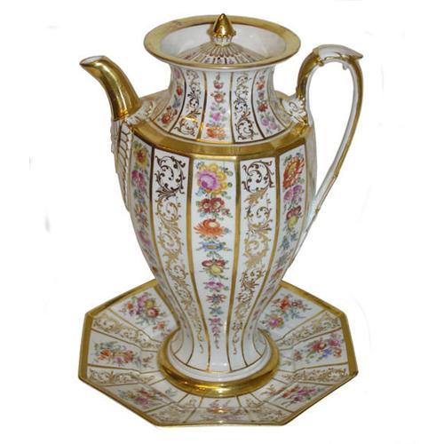 Included here is an antique gilded and enamelled Meissen porcelain chocolate pot and matching plate. Plate measures 8" by 8" by 1" and pot measures 10.75" by 7.5" by 5.25". Total weight is 3 lbs. 8 oz. There is a small chip from the corner of the plate which has been regilded, and a repair break to the underside of the lid of the pot. There are no other repairs or damages.