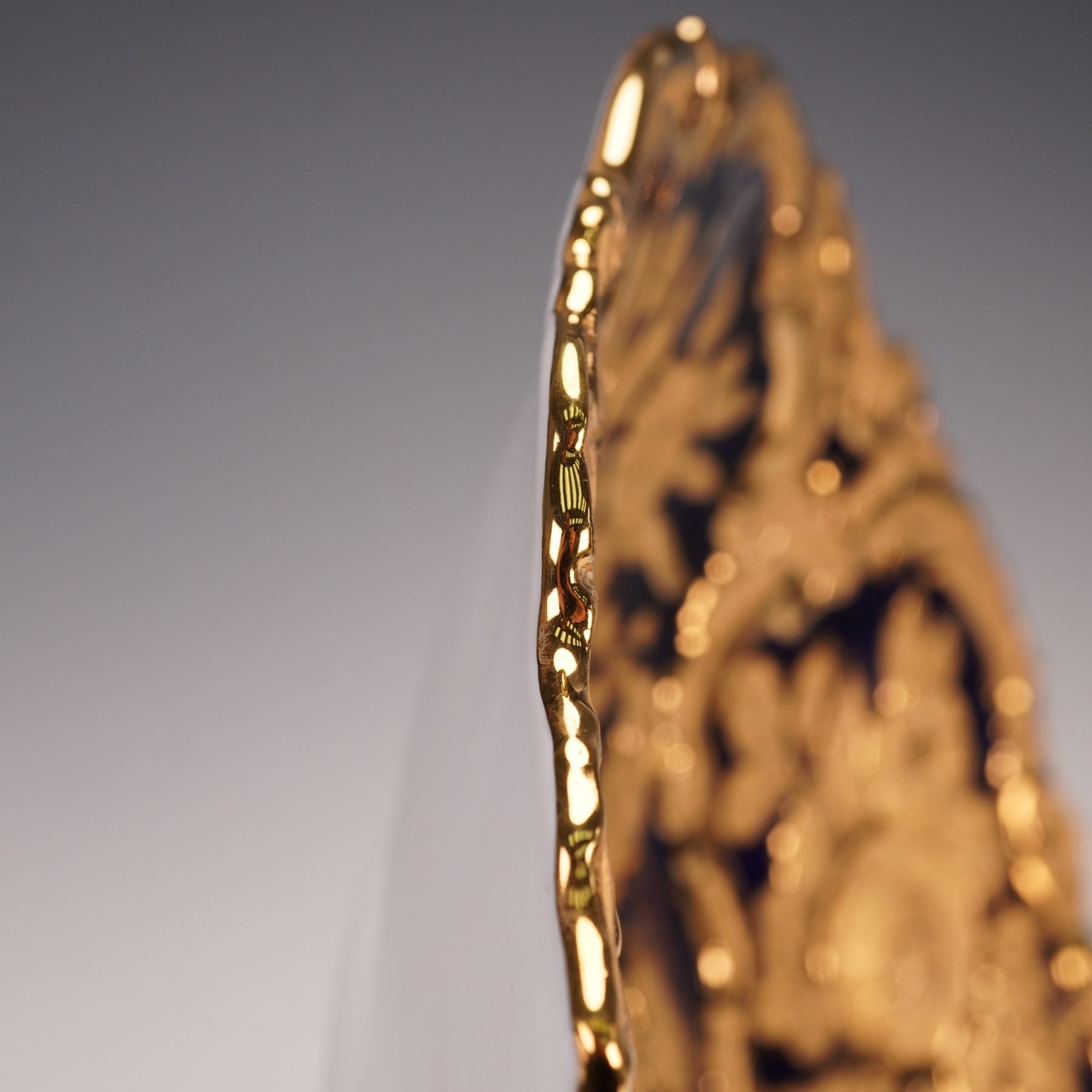 This Meissen porcelain cabinet bowl presents a striking cobalt blue ground adorned with raised gilt decoration in ornate floral and foliate motifs. The richly worked gilding extends across the interior surface and rim, creating a bold contrast against the deep blue ground. The scalloped edge and elaborate relief detail give the piece a distinctly decorative character. The base is marked with the Meissen backstamp.