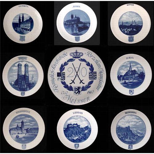 Rare collection of nine Meissen display plates decorated in blue over a white background. The set includes a large (14" diameter) plate commemorating the 200th anniversary of Meissen (1710-1910). The other eight plates (10" diameter) represent topographical views of the following German cities: Chemnitz, Meissen, Zittau, Munchen, Borna, Konigsbruck, Leisnig and Heidelberg. They have slightly different designs and appear to have been collected over time. All have the Meissen, first quality, crossed-swords mark on the underside. The larger plate has the crossed swords with a dot mark used in the 1924-1933 period. The set of city plates are also pre-1933. Close-up photos of each plate, including marks, are available for your review. All plates have been used as display only and are in very good condition, as shown. Please ask questions, request additional photos and shipping costs before bidding.