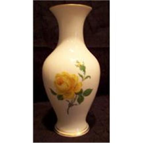 Beautiful Meissen Porcelain vase with hand painted yellow roses. Meissen is the premier manufacturer of the finest porcelain. The vase is a light ivory color with a large hand painted yellow rose on the front, and two small rose buds on the back. The top rim as well as the base is gilded gold. The bottom is marked with the blue crossed Meissen sword mark along with the painters number 020670/56 and stamped with the numbers 297, and 59498. The vase measures 9 1/4" tall, 3" wide at the top mouth, and 4 1/2" at it's widest point. This is in excellent condition showing no wear what so ever. Absolutely beautiful!