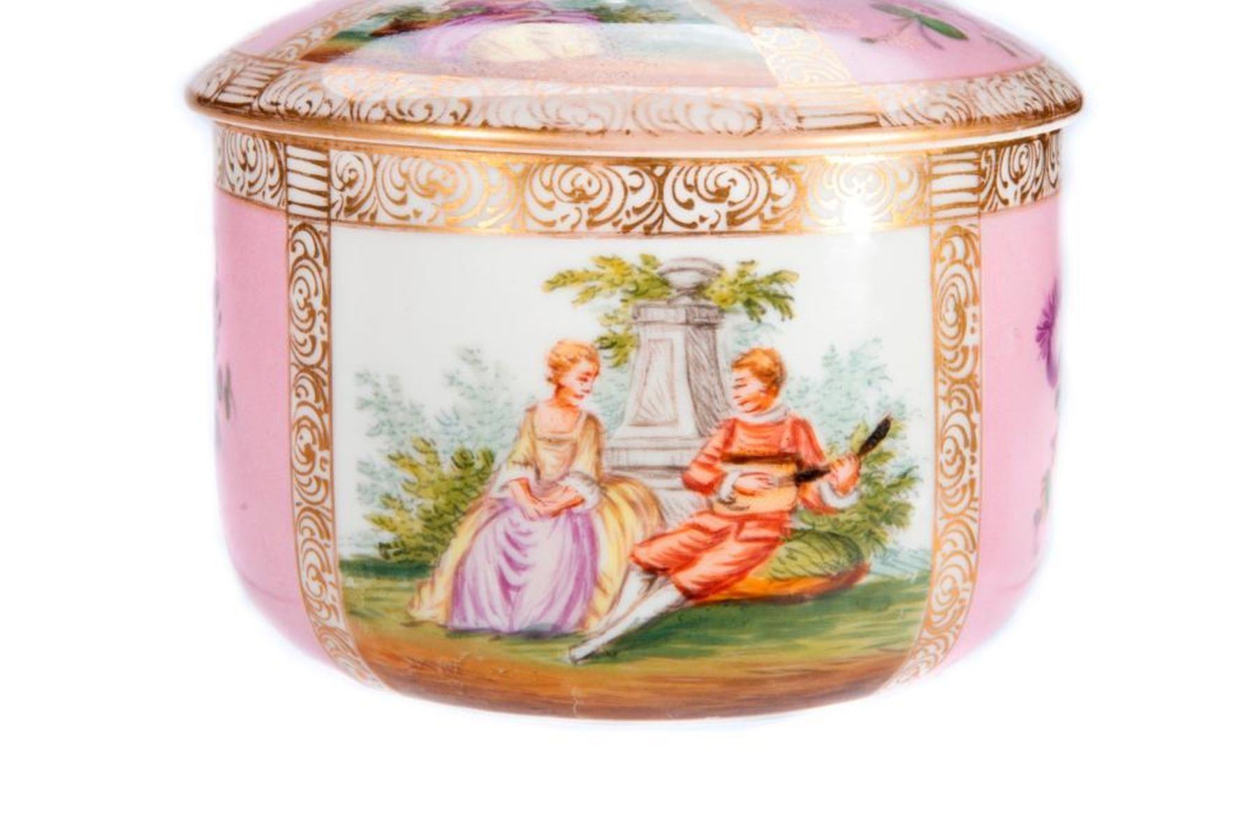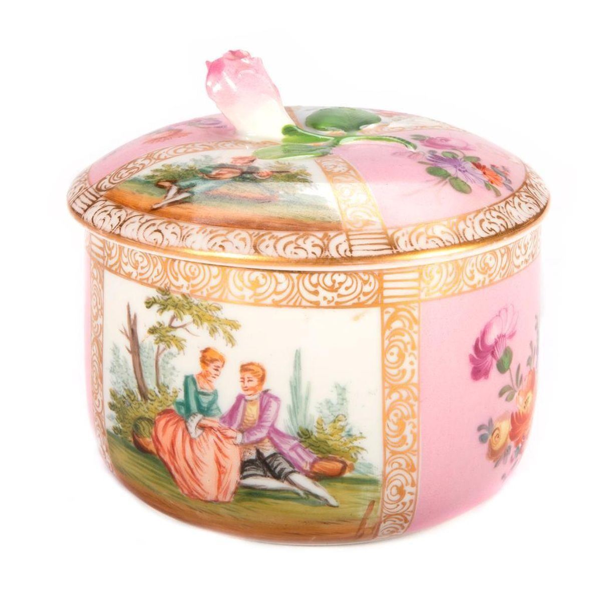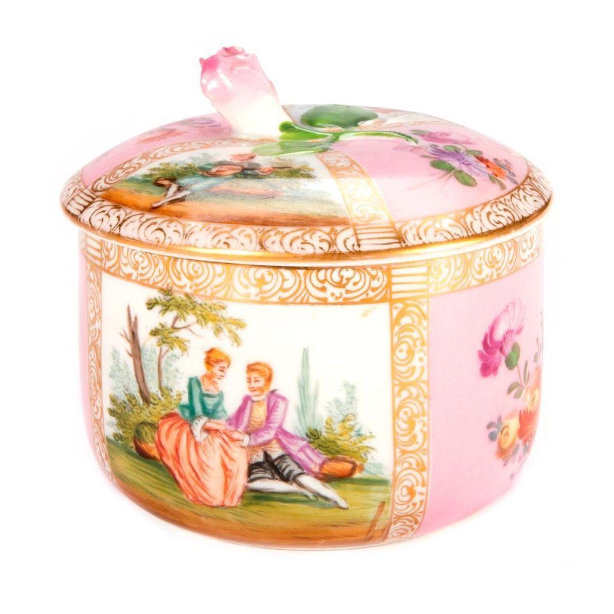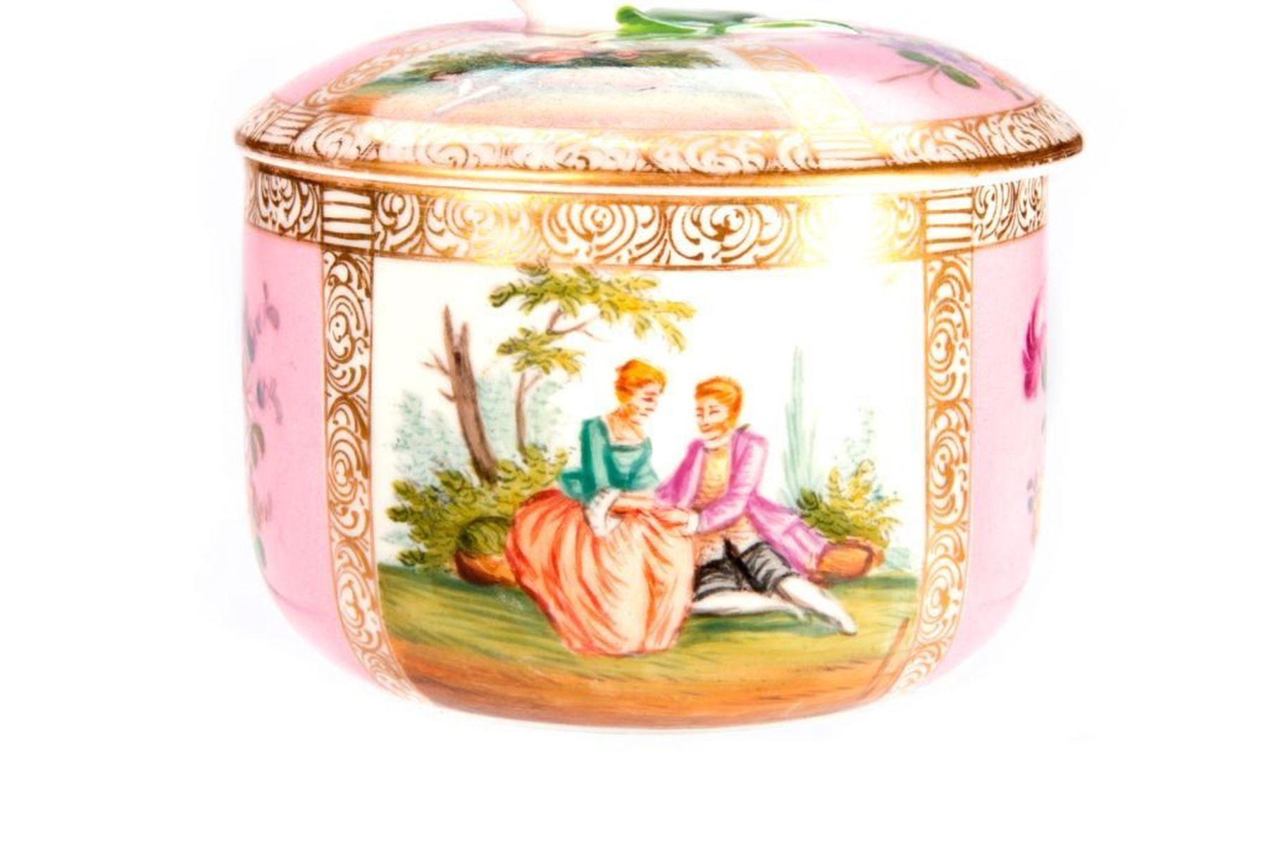 Meissen Pink Powder Box with painted panels. H-4.5" Dia-4" Condition: Excellent, wear from age