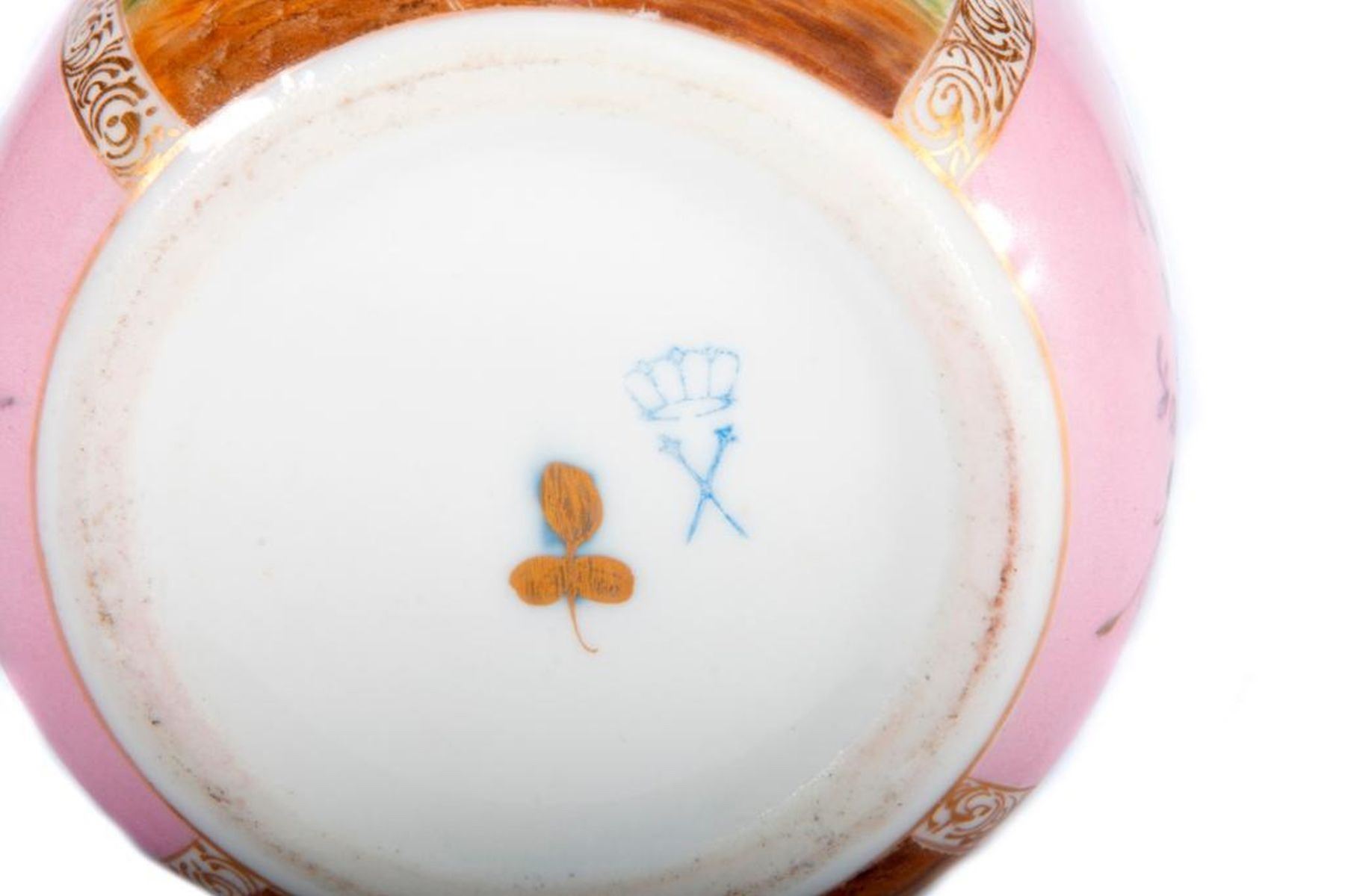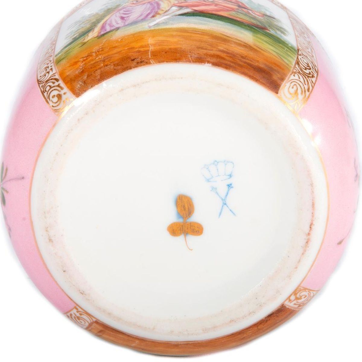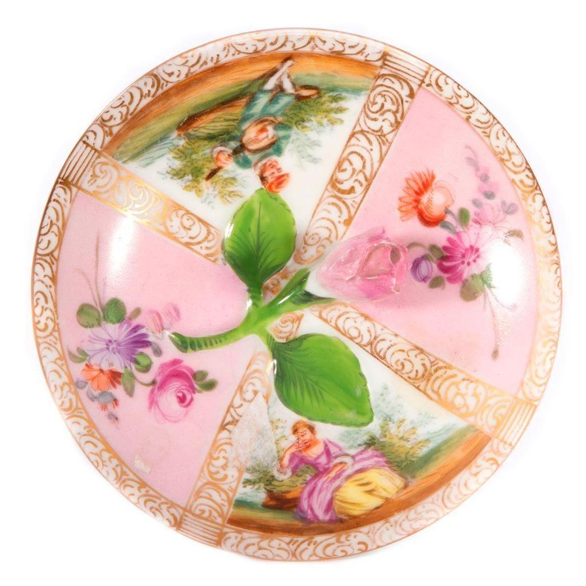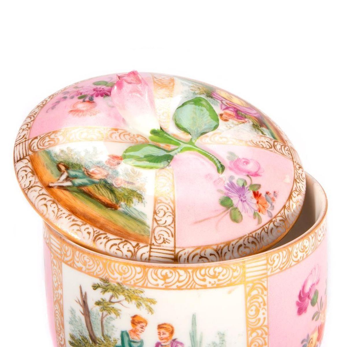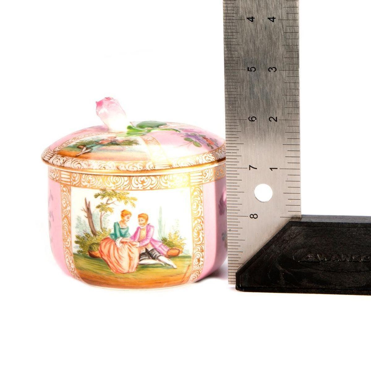 Meissen Pink Powder Box with painted panels. H-4.5" Dia-4" Condition: Excellent, wear from age