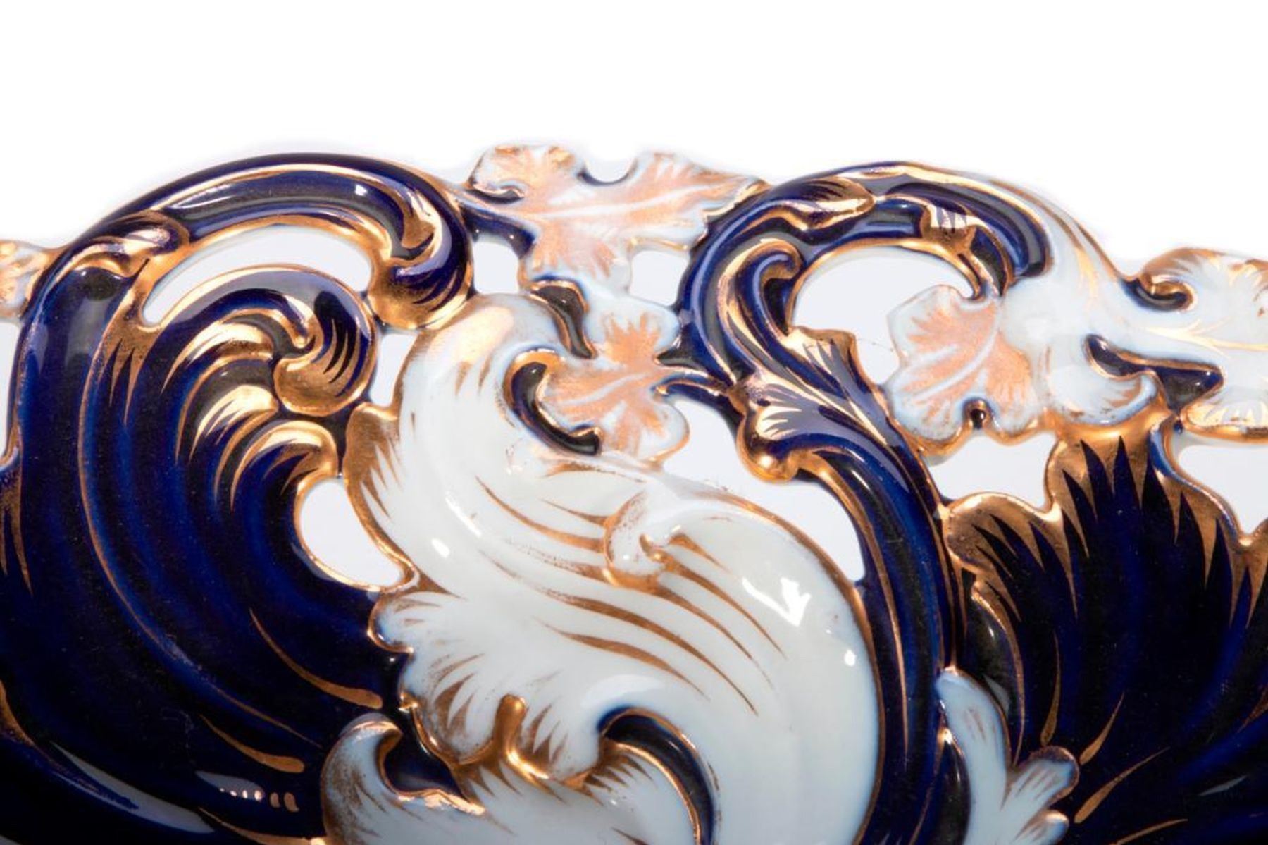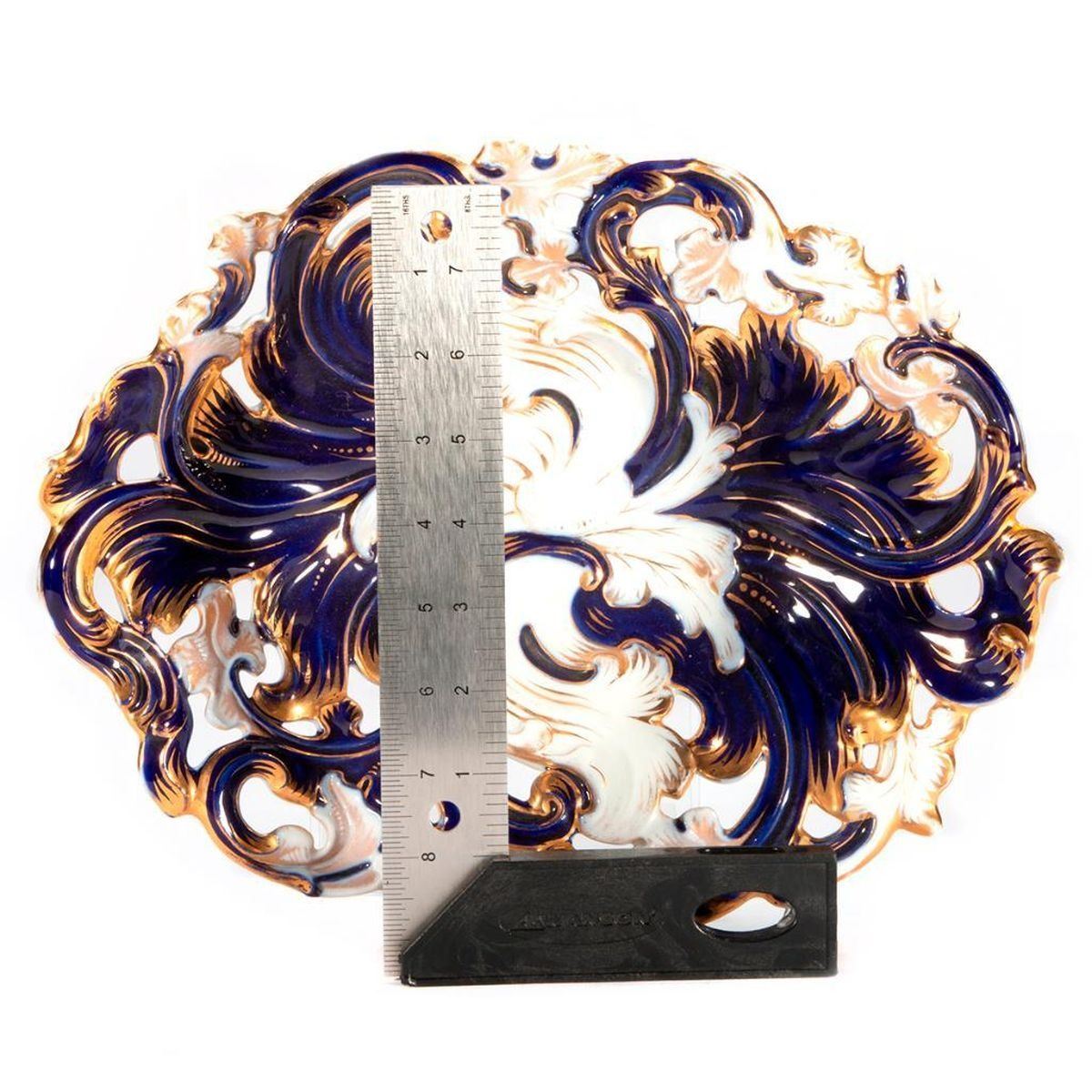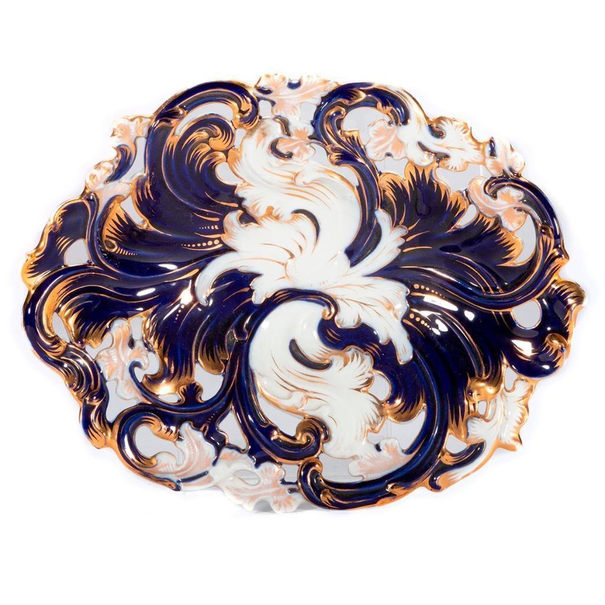 Large oval reticulated sereving bowl of swirling leaves. Marked in underglaze blue. H-3" W-12.5" D-10" Condition: no damage