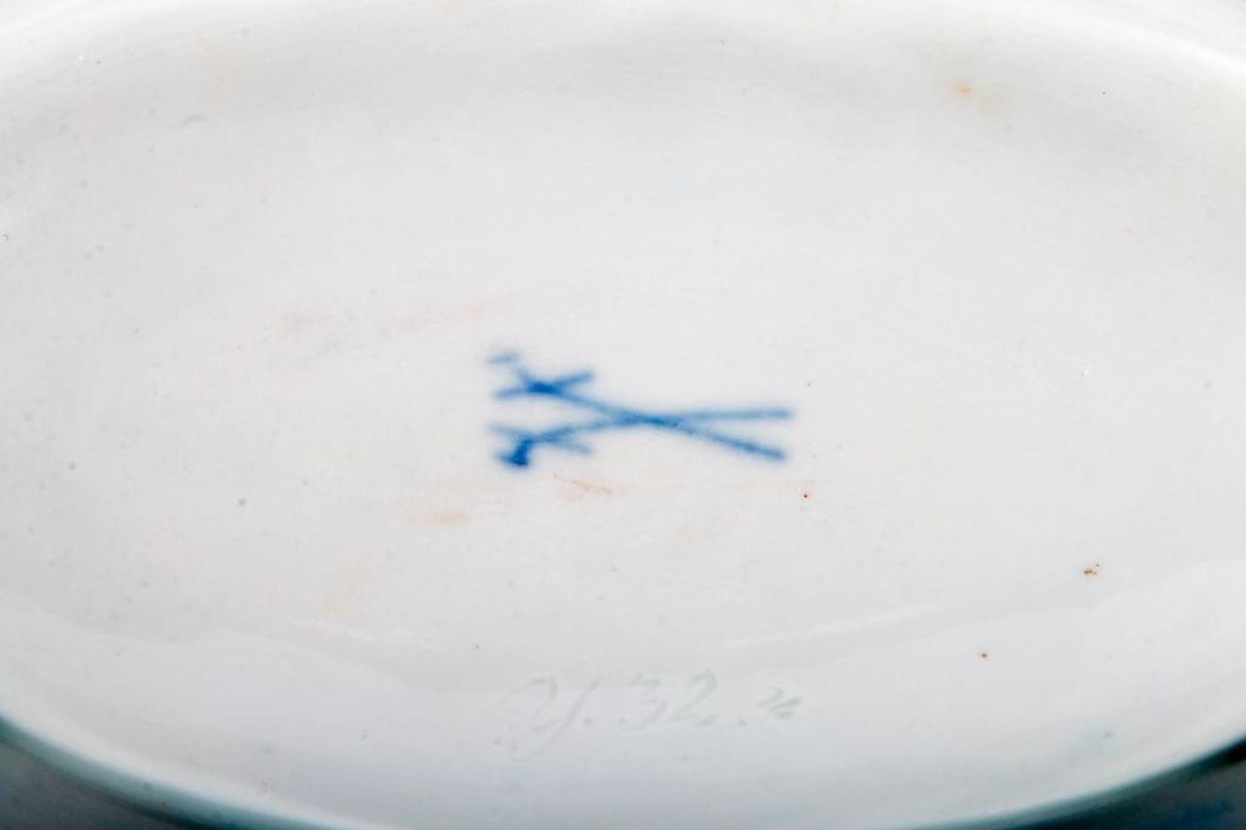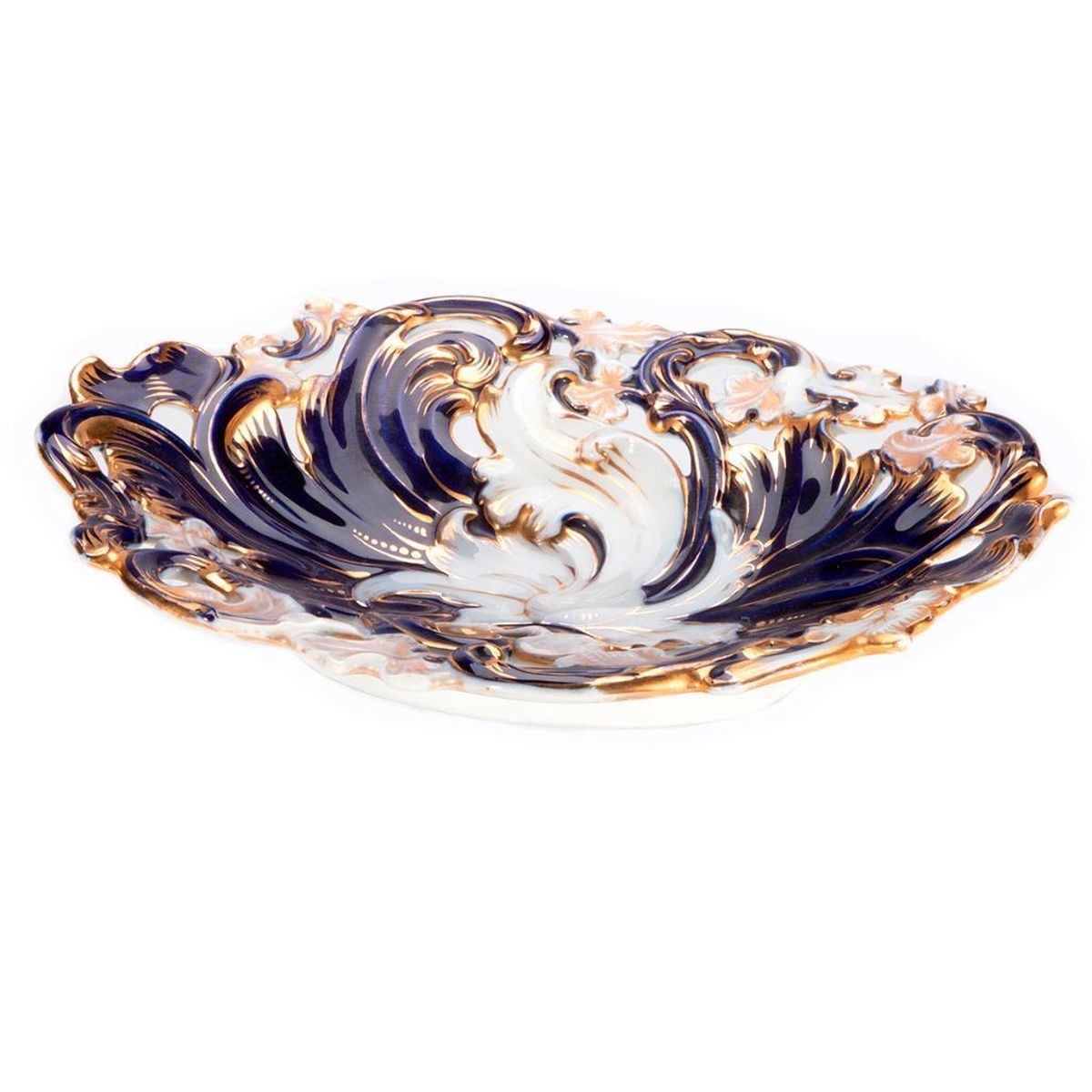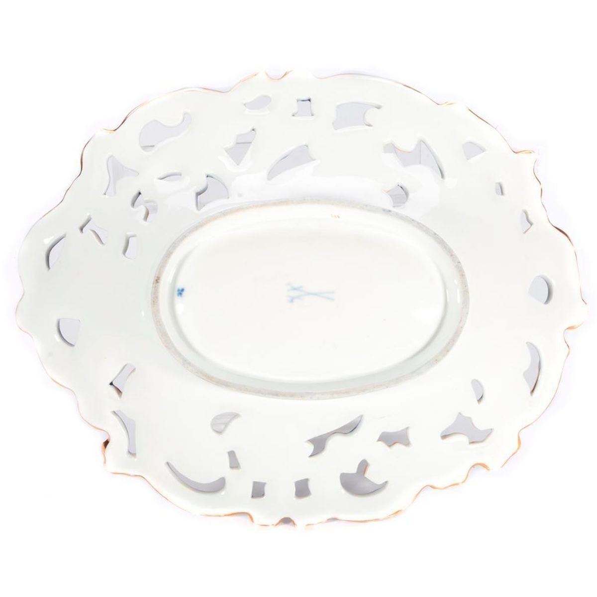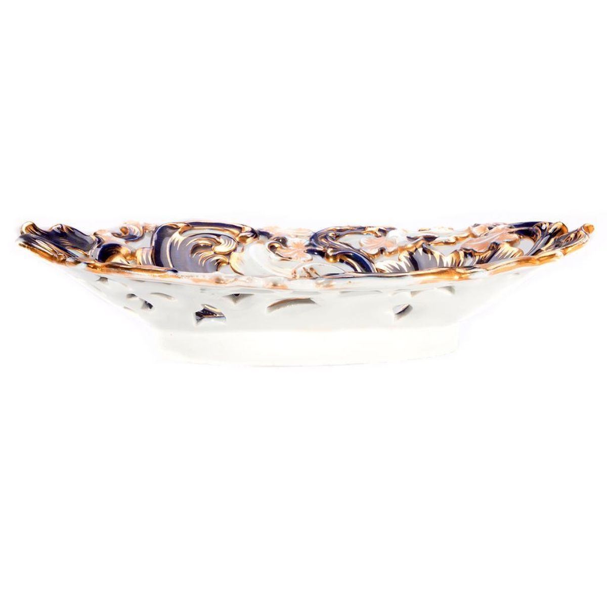 Large oval reticulated sereving bowl of swirling leaves. Marked in underglaze blue. H-3" W-12.5" D-10" Condition: no damage