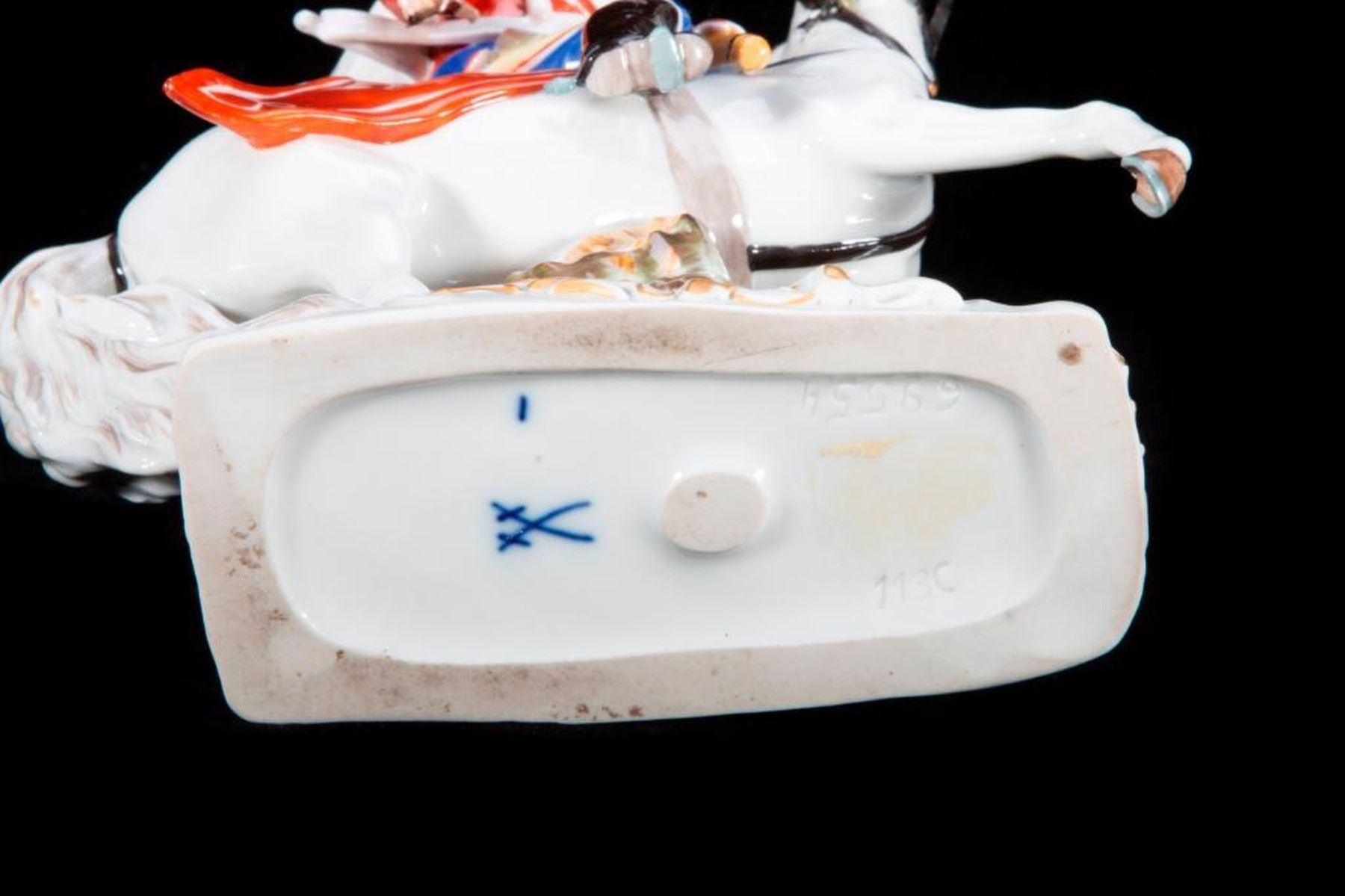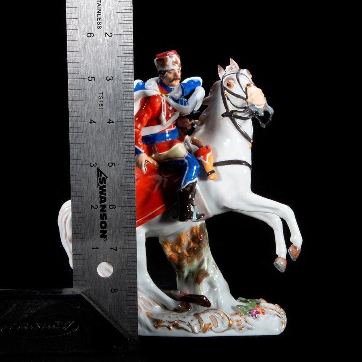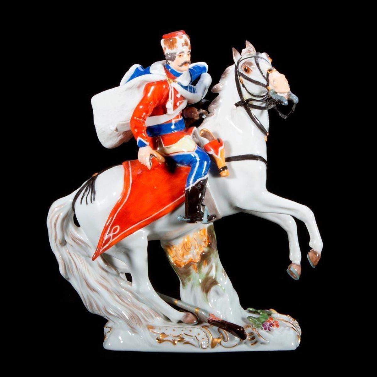 Meissen figure of a Russian Cossack. Dimensions: H-7", W-6.5", D-4.5". Condition: Near perfect, rifle has come loose from his hand.