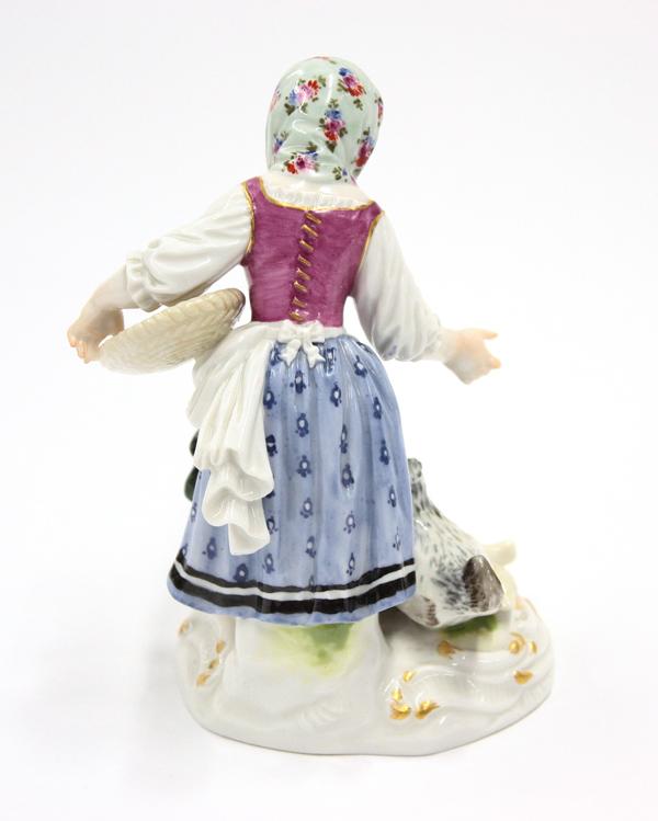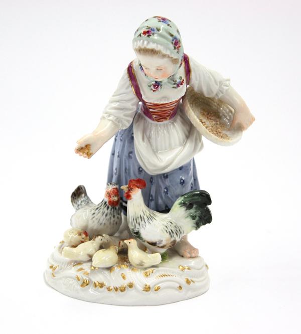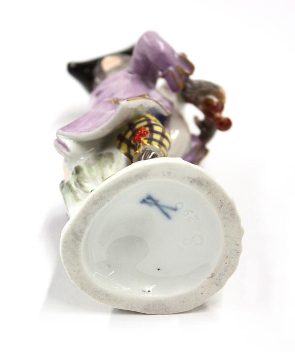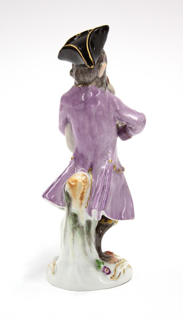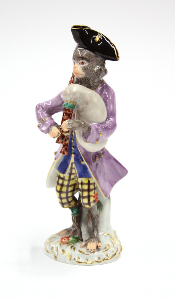 (lot of 3) Meissen figural groups, each polychrome decorated and marked with underglaze cross sword marks, one depicting a youg girl feeding game and rising on a Rococo style plinth, incised 2874, two depicting musical monkeys, each adorned in colorful attire and rising on a naturalistic base, largest 5''h