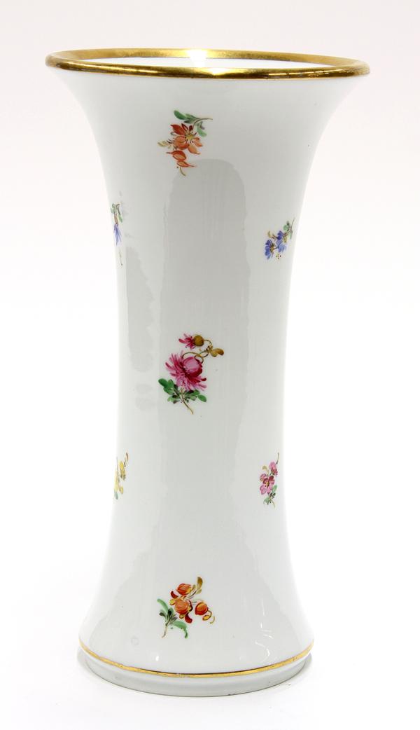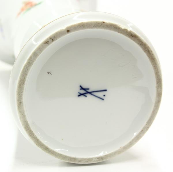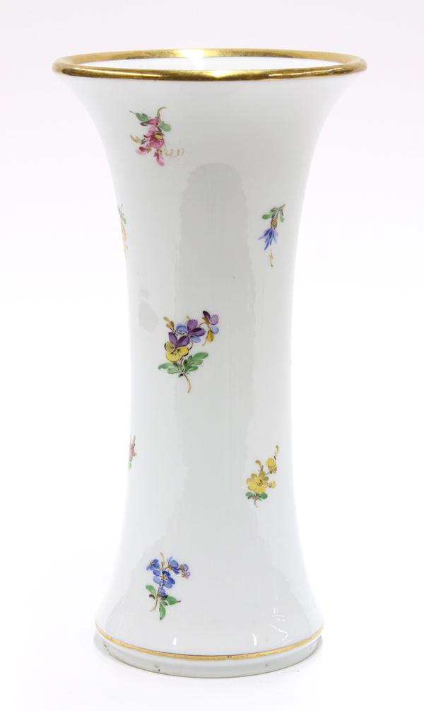 Meissen vase, the tapering body having a gilt rim above the floral decorated body, marked with underglaze cross swords, 9.5''h