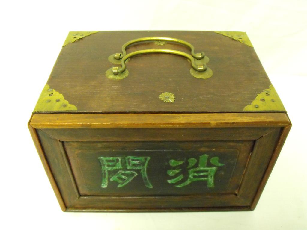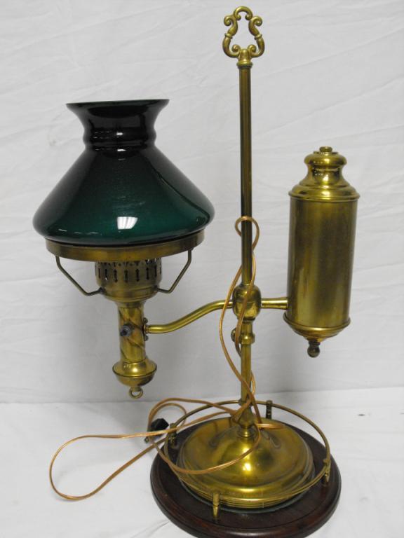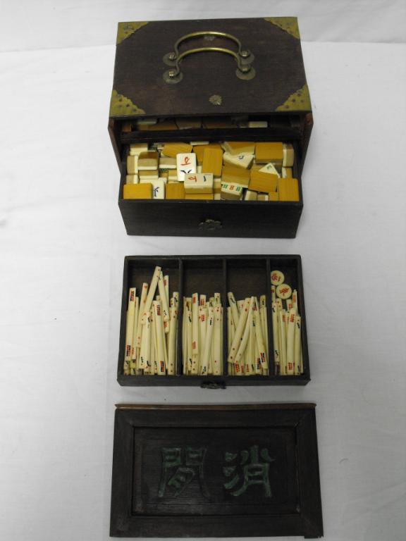 Ornate wood and brass mejong set and table lamp with green glass shade and brass and wood base in good condition