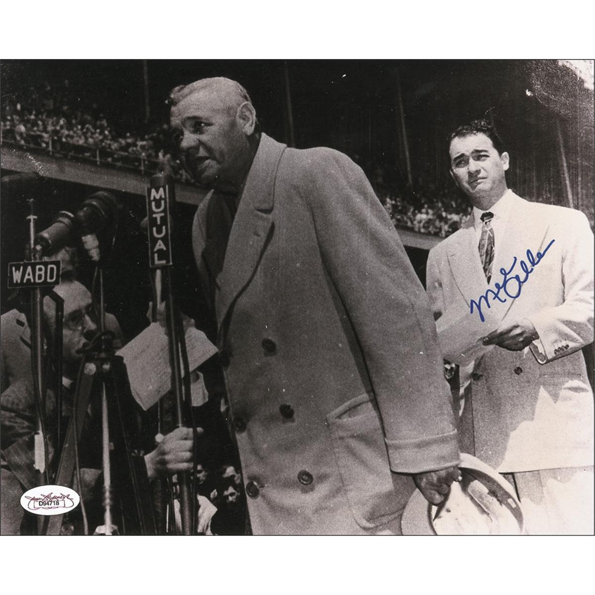 Glossy 10 x 8 photo of Allen looking on as Babe Ruth addresses Yankee Stadium for the final time, signed in blue felt tip. In very fine condition. Accompanied by a certificate of authenticity from James Spence.