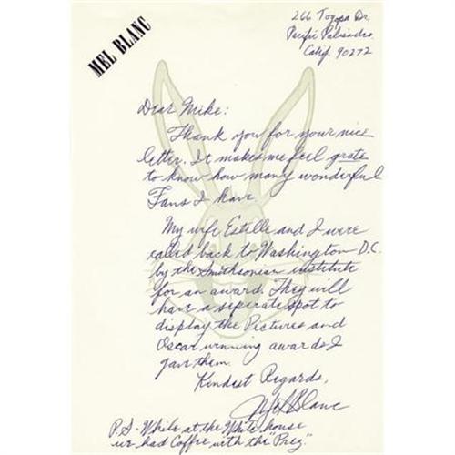 <B>Mel Blanc Handwritten Letter.</B></I> A single-page letter on personal stationery with a large Bugs Bunny logo, handwritten and signed by legendary voiceover artist Mel Blanc in blue ballpoint. In it, Blanc describes a trip to Washington, D.C., to receive an award from the Smithsonian Institute; he concludes with "P.S. While at the White House we had coffee with the 'Prez'." The letter is in Excellent condition. <I>Accompanied by LOA from PSA/DNA.</B></I><BR><BR><b>Shipping:</b> Flat Material, Small (<a target="_blank" href="http://www.heritageauctions.com/common/shipping.php">view shipping information</a>)