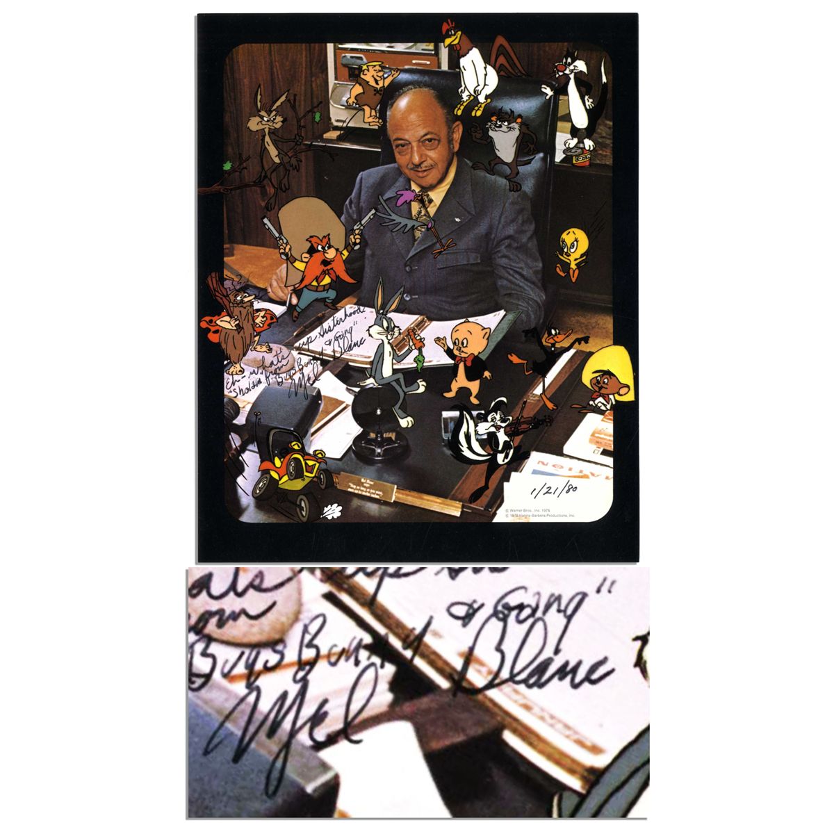 Famed voice actor Mel Blanc writes across the image of himself at his desk, ''Eh - what's up sisterhood? / 'Sholam' [sic] from 'Bugs Bunny & Gang' / Mel Blanc'' in black ink. He adds: ''1/21/80'' to lower right corner. Blanc provided the voices for Warner Brothers and Hanna-Barbera characters Bugs Bunny, Yosemite Sam, Barney Rubble, Tweetie Bird and others. These characters are superimposed on the matte photo, giving the appearance that they inhabit Blanc's desk. Near fine.