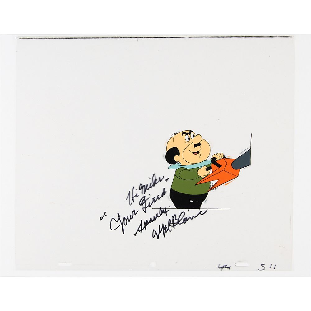 (Hanna-Barbera Studios, 1980s) Original production cel featuring Cosmo Spacely from The Jetsons, signed and inscribed in black felt tip by the famed voice actor, "Hi Mike, 'Your Fired,' Spacely, Mel Blanc." Image measures 4 x 3.5, with overall dimensions of 12.5 x 10.5. In fine condition, with a trivial chip to the black paint.