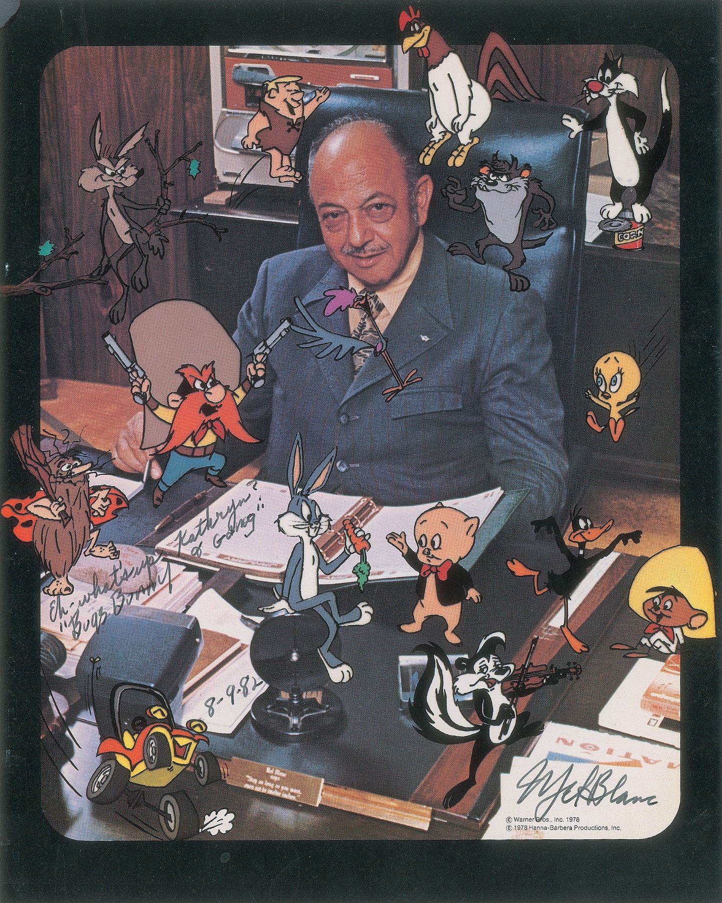 Color semi-glossy 8 x 10 cardstock photo of Blanc surrounded by the legendary characters he voiced, signed and inscribed in thin black felt tip, "Eh—what's up Kathryn? 'Bugs Bunny & Gang,' 8-9-82, Mel Blanc.” In very good to fine condition, with a paperclip impression to the top edge, and small area of surface loss to the upper left corner tip.