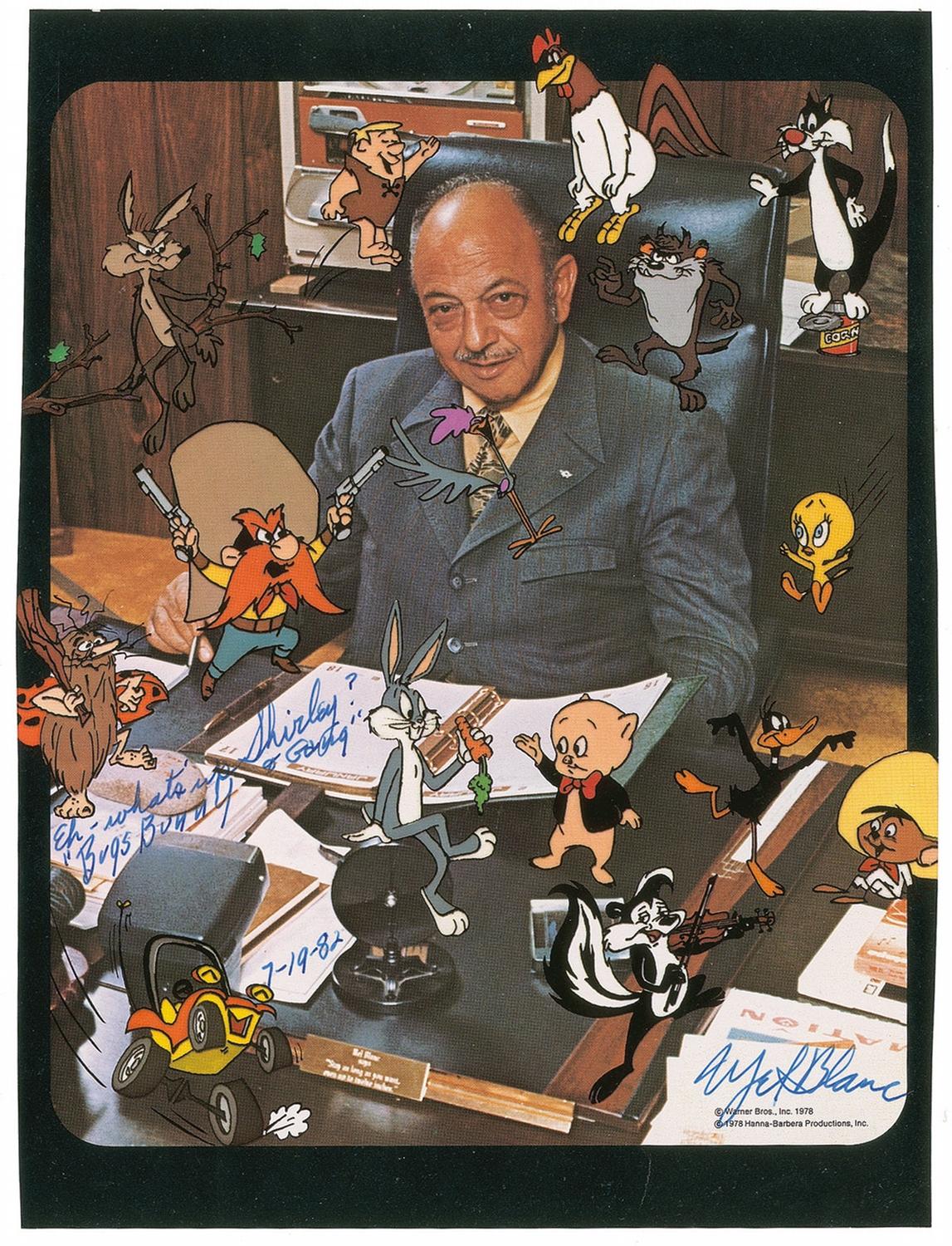 Color 8 x 10 cardstock photo of Blanc surrounded by his animated pals, signed and inscribed in blue felt tip, “Eh—What’s up, Shirley? Bugs Bunny & Gang, 7-19-82, Mel Blanc.” In fine condition.