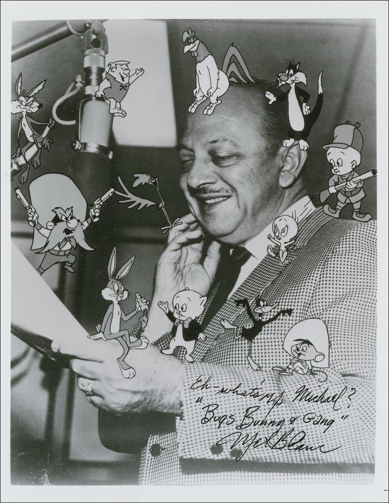 Glossy 8 x 10 photo of Blanc in the recording studio surrounded by his animated friends, signed and inscribed in black ink “Eh—what’s up Michael? ‘Bugs Bunny & Gang’ Mel Blanc.” In fine condition, with scattered creases and light surface impressions from collector’s notations on reverse.