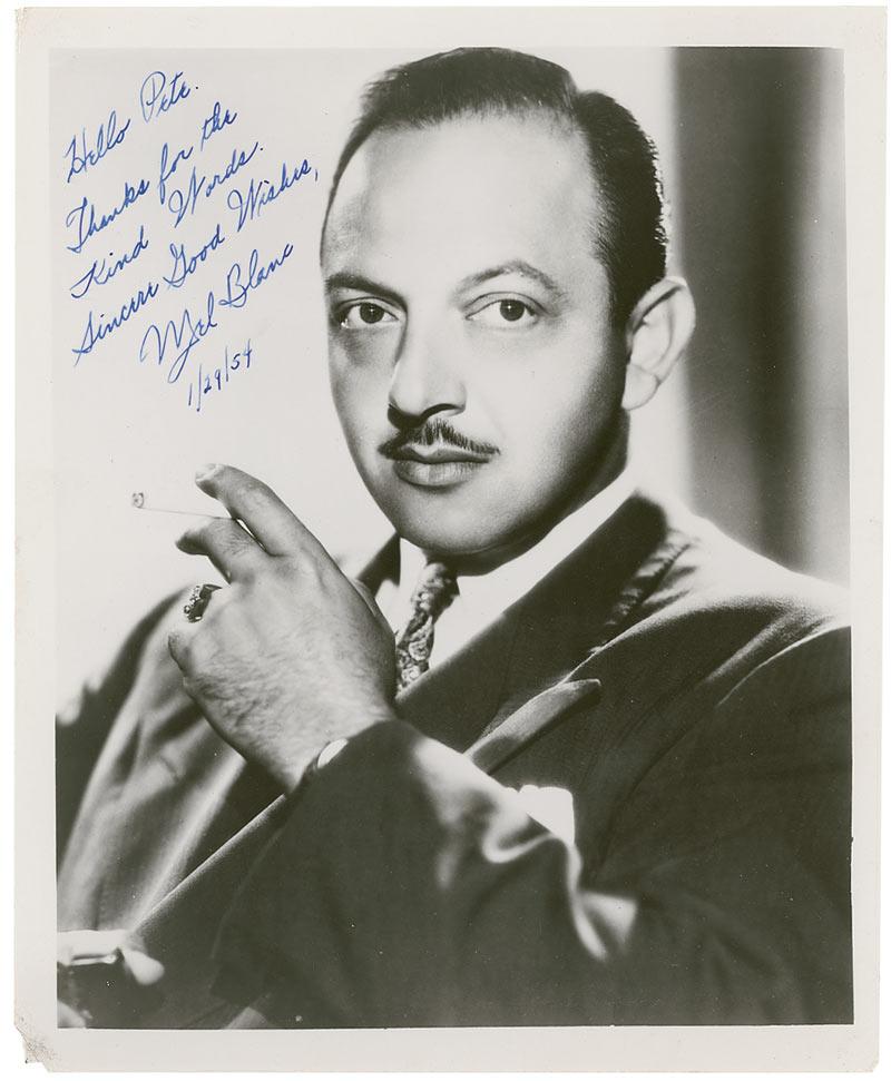 Vintage glossy 8.25 x 10 publicity photo of Blanc holding a cigarette, signed and inscribed in fountain pen “Hello Pete. Thanks for the kind words. sincere good wishes, Mel Blanc 1/28/54.” Light creasing, bent lower left corner, and areas of staining on his jacket, otherwise fine condition.