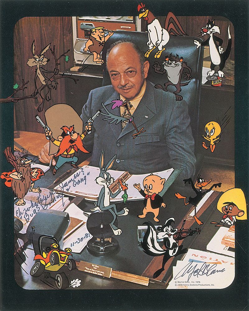 Color 8 x 10 cardstock photo of Blanc surrounded by his characters, signed and inscribed in black felt tip, “Eh—what’s up James? ‘Bugs Bunny & Gang,’ 11-30-81, Mel Blanc.” In fine condition, with slight haloing to the inscription.