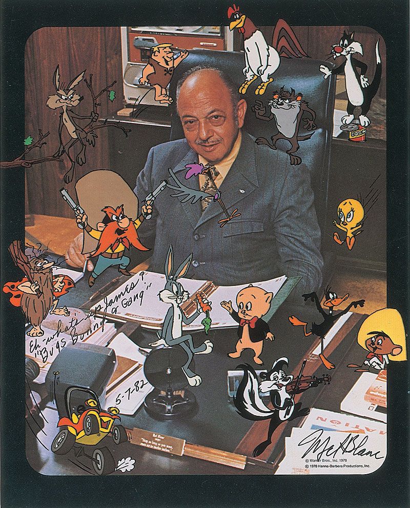 Color 8 x 10 cardstock photo of Blanc surrounded by his characters, signed and inscribed in black felt tip, “Eh—what’s up James? ‘Bugs Bunny & Gang’ 5-7-82, Mel Blanc.” In fine condition.
