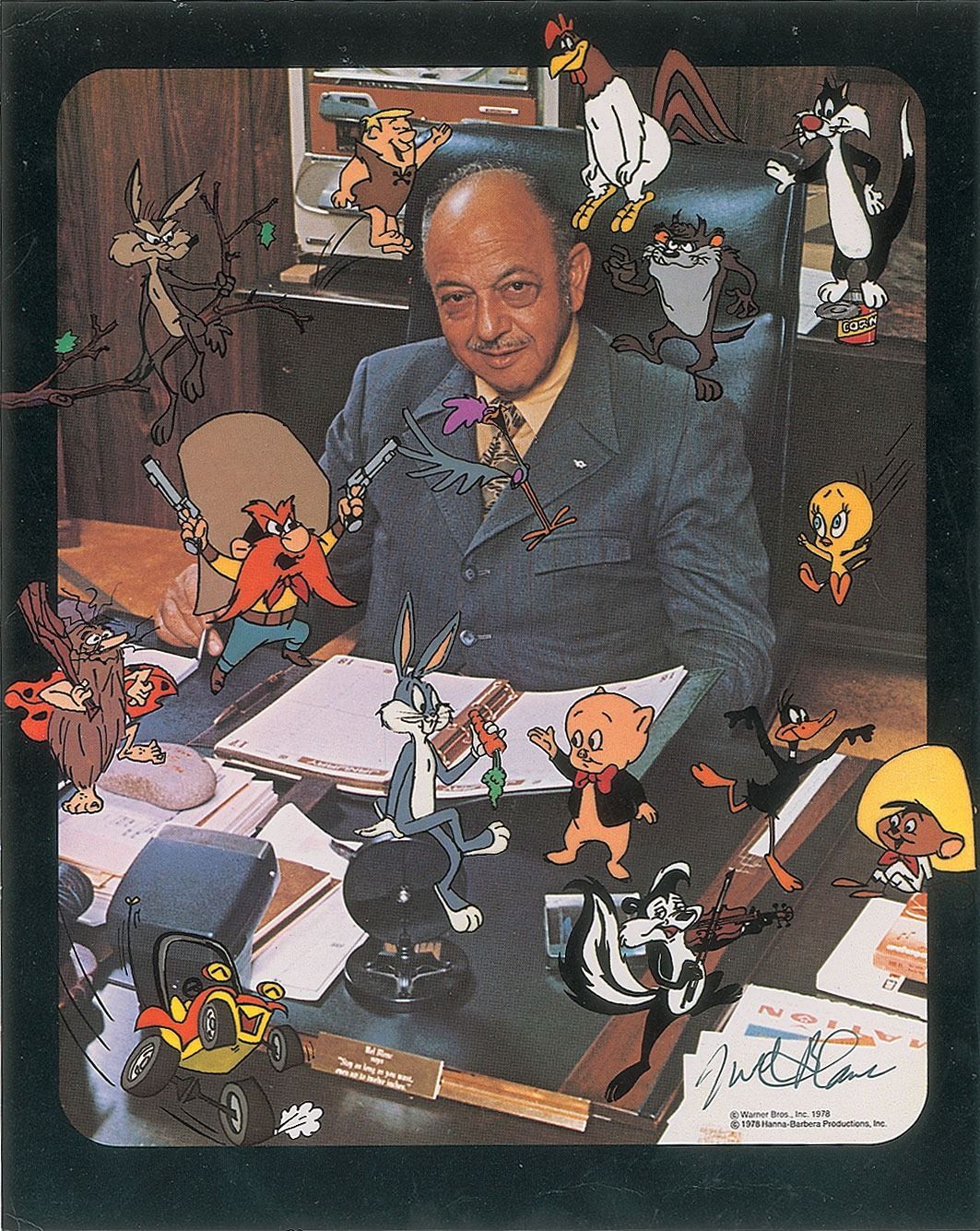 Color 8 x 10 cardstock photo of Blanc surrounded by the legendary characters he voiced, signed in the lower right corner in black felt tip. In fine condition, with scattered light creasing.
