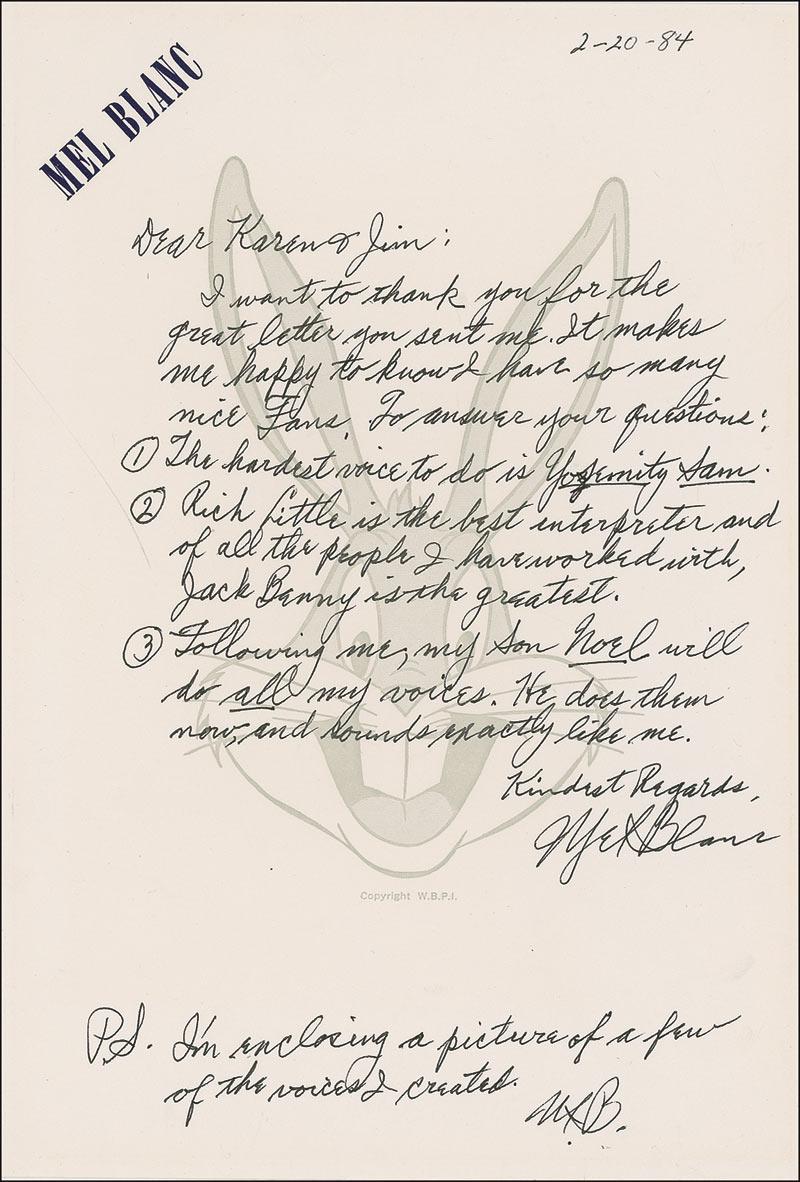 Two items: ALS, one page, 7.25 x 10.5, dated February 20, 1984, personal letterhead. Blanc writes to a couple of his fans. In part: “It makes me happy to know I have so many nice Fans…The hardest voice to do is Yosemite Sam…Following me, my son Noel will do all my voices. He does them now, and sounds exactly like me.”; and a color 8 x 10 photo of Blanc and some of his animated friends, signed and inscribed in black felt tip, “Eh—What’s up, Jesse? Bugs Bunny & Gang, 9-10-86, Mel Blanc.” In fine condition. RRAuction COA.