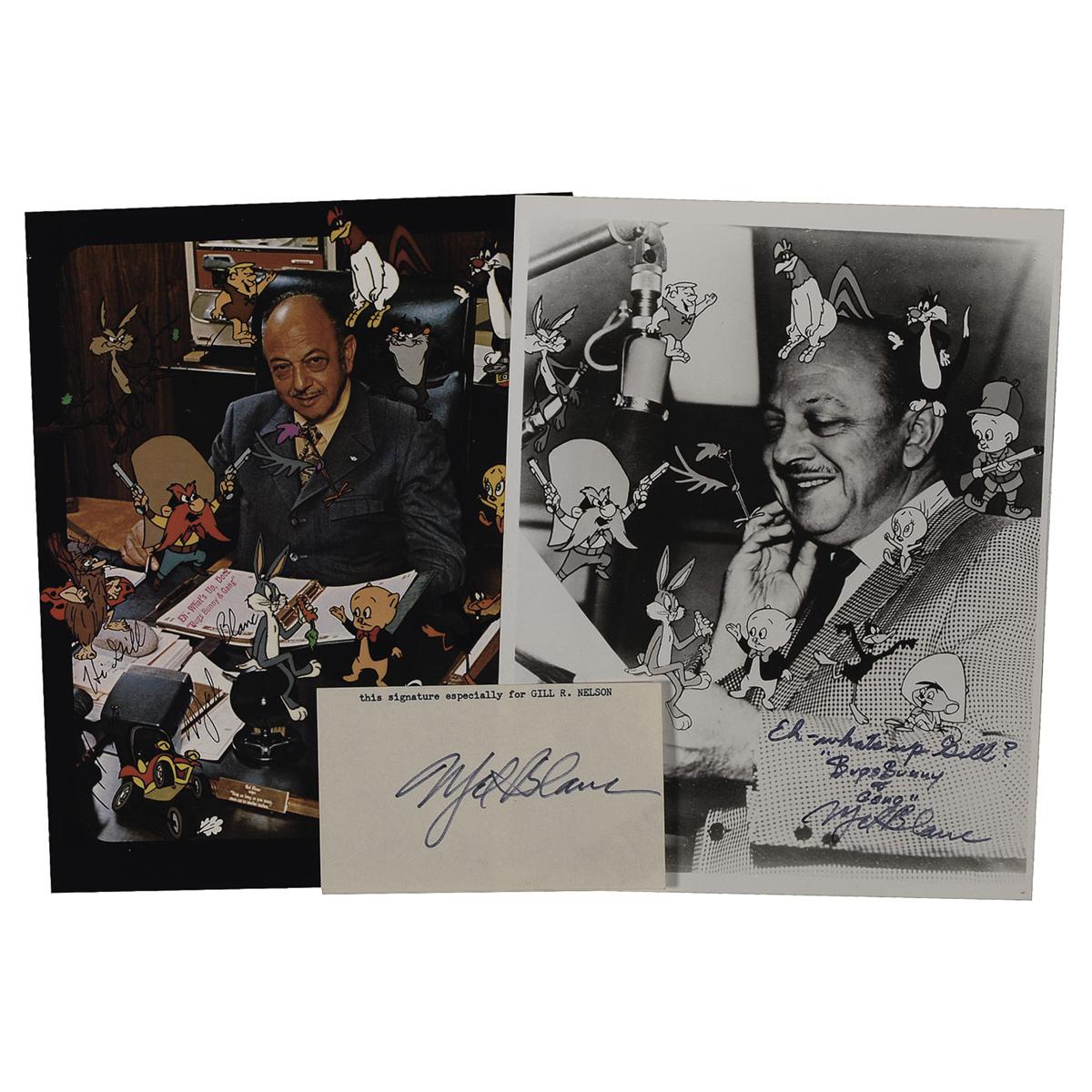 Three items: two 8 x 10 photos, one glossy and one color cardstock, each signed and inscribed in black ink; and a felt tip signature “Mel Blanc,” on an off-white 5 x 3 card, with a typed collector’s inscription along the top. In fine condition, with a few scattered light surface marks and impressions to photo.