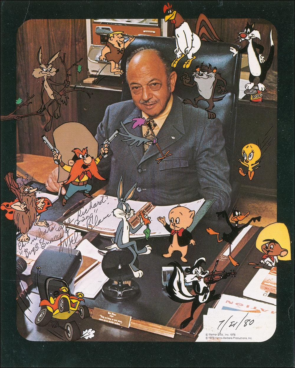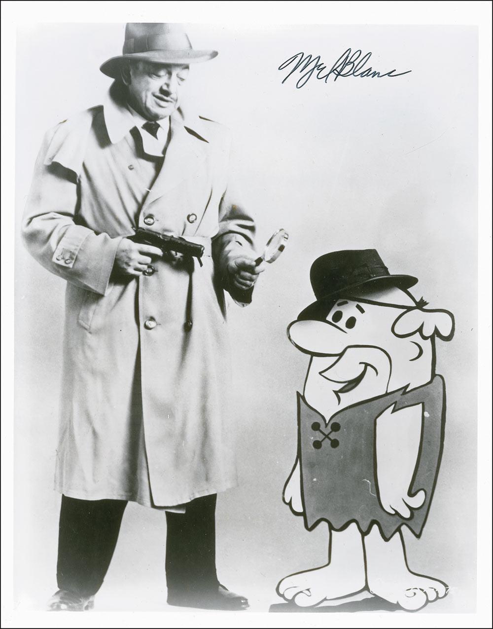Two items: 8 x 10 glossy photo of Blanc as a private detective posing with his partner, Barney Rubble, signed in black felt tip; and a color 8 x 10 cardstock photo of Blanc surrounded by his animated pals, signed and inscribed in blue felt tip, “Eh—What’s up, Richard? Bugs Bunny & Gang, Mel Blanc, 7-21-80.” In overall fine condition with a crease to upper left corner and fingerprint marks to the black surface of the color photo.