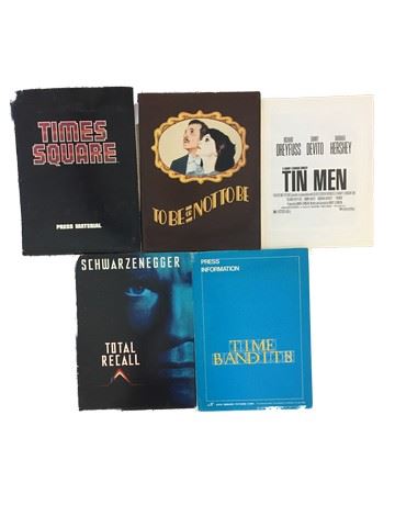 Collection of 5 press kits with black and white publicity stills included, sized mainly 8x10's from various movie studios. (1980's-90's). From Associated Film Distribution "Times Square" (1980) starring Trini Alvarado as Pamela Pearl, Robin Johnson as Nicki Marotta, and Tim Curry as Johnny, includes 9 stills. From 20th Century Fox "To Be Or Not To Be" (1983) starring Mel Brooks as Frederick Bronski, Anne Bancroft as Anna Bronski, and Charles Durning as S.S. Colonel Erhardt, includes 6 stills. From Touchstone Pictures "Tin Men"(1987) starring Richard Dreyfuss as BB, Danny DeVito Ernest Tilley, and Barbara Hershey as Nora Tilley, 1 still included. From Tri Star Pictures "Total Recall"(1990) starring Arnold Schwarzenegger as Douglas Quaid, Sharon Stone as Lori Quaid, and Rachel Ticotin as Melina, includes 12 stills. From Avco Embassy Pictures "Time Bandits" (1981) starring Sean Connery as Agamemnon, David Rappaport as Randall, and Kenny Baker as Fidget, includes 10 stills.