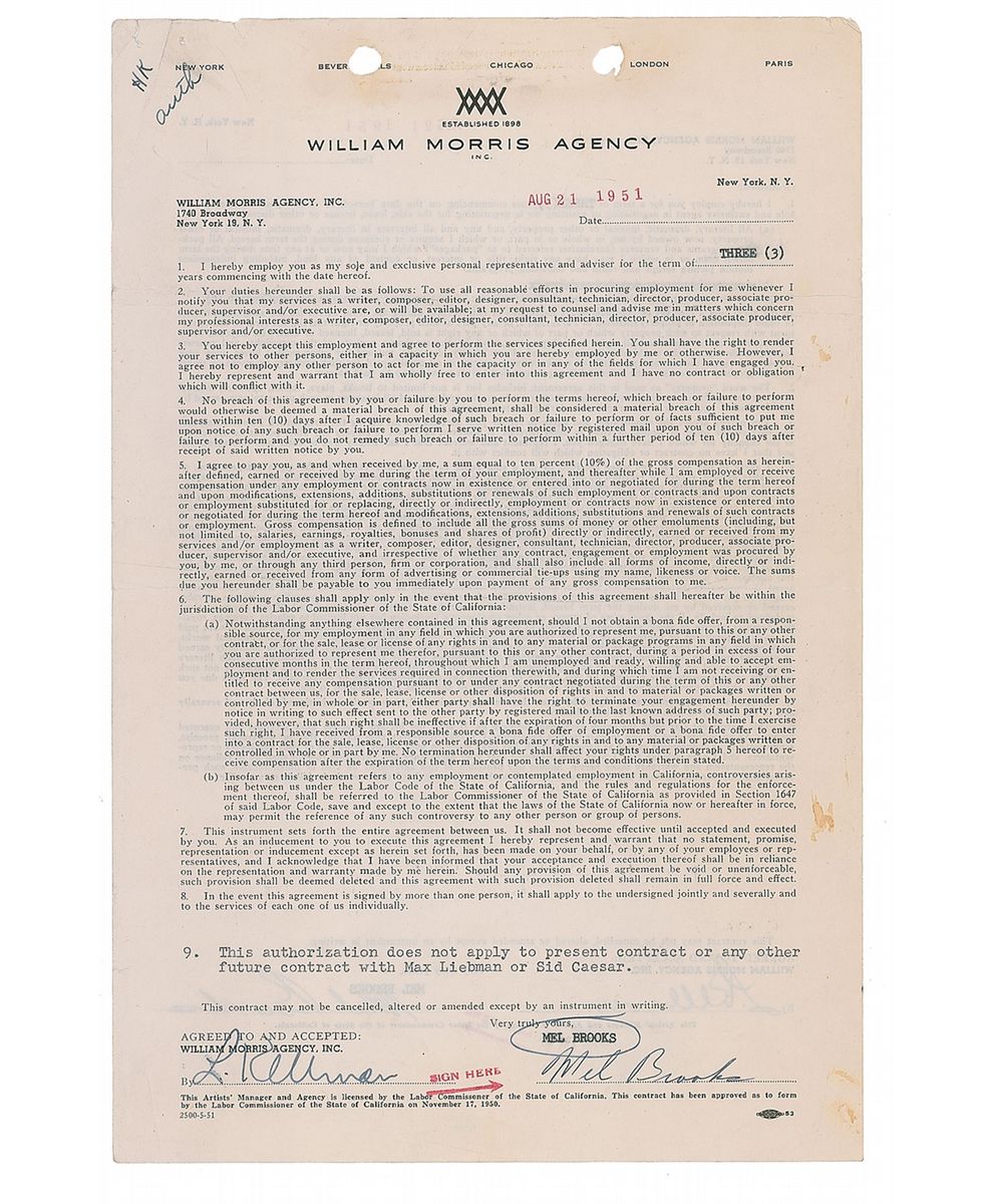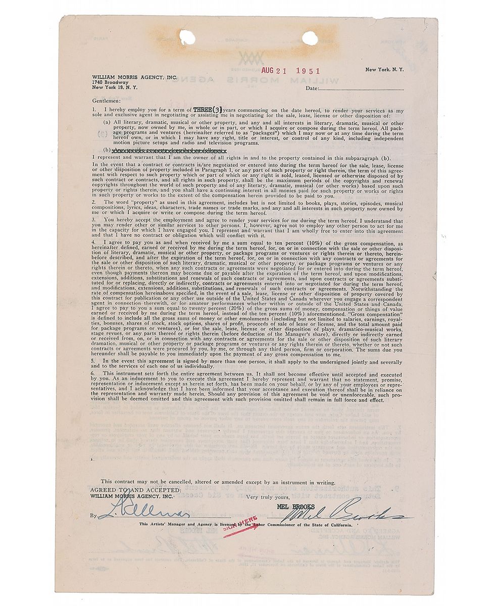Very early DS, one page both sides, 8.5 x 13, August 21, 1951. Contract between Brooks and the William Morris Agency in which he agrees to be represented by the firm for a period of three years at a rate of 10% of earnings. Signed on both sides by Brooks and an agency representative. Some small tears and toning at the top, scattered creases, a few small stains, and expected document wear, otherwise fine condition.