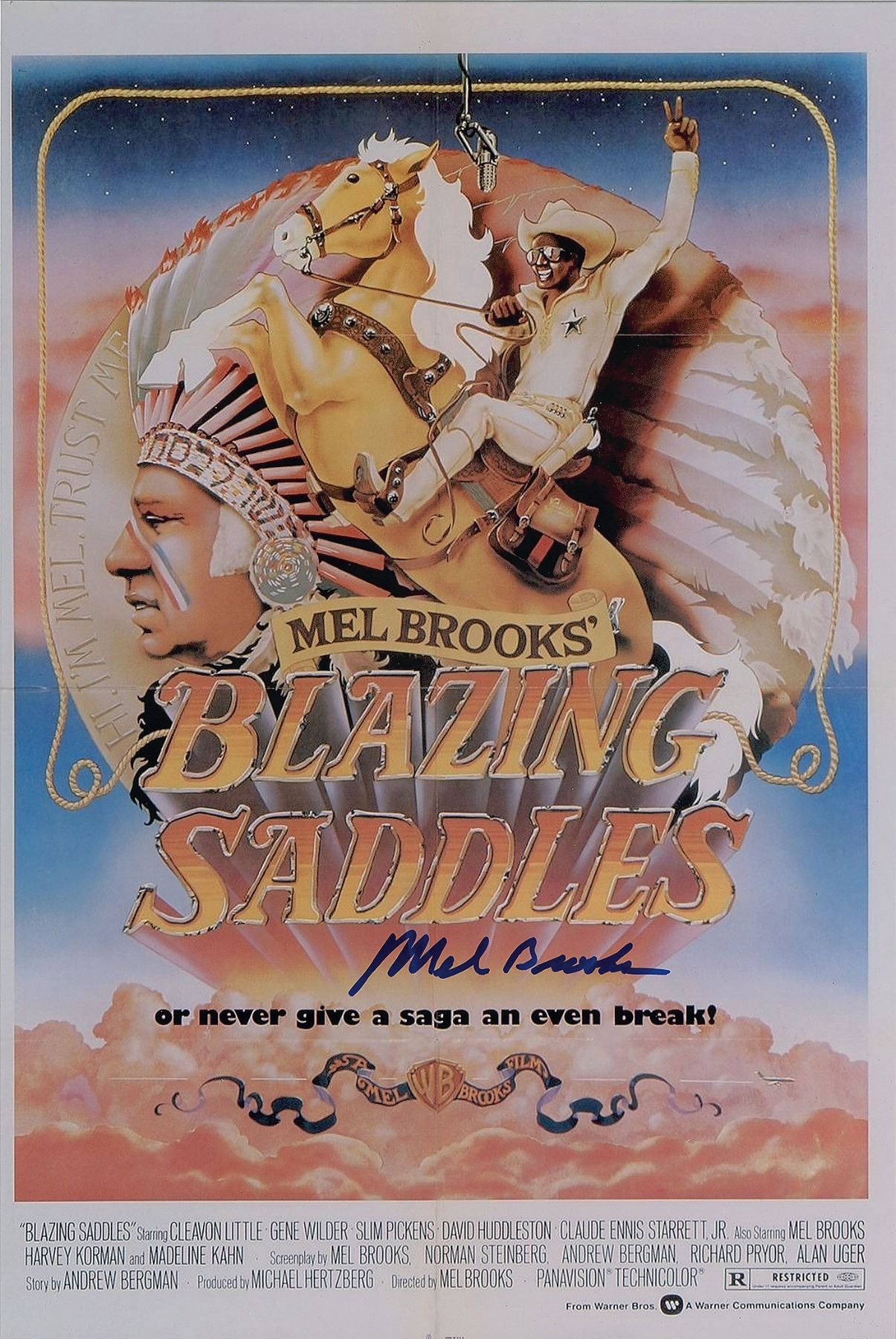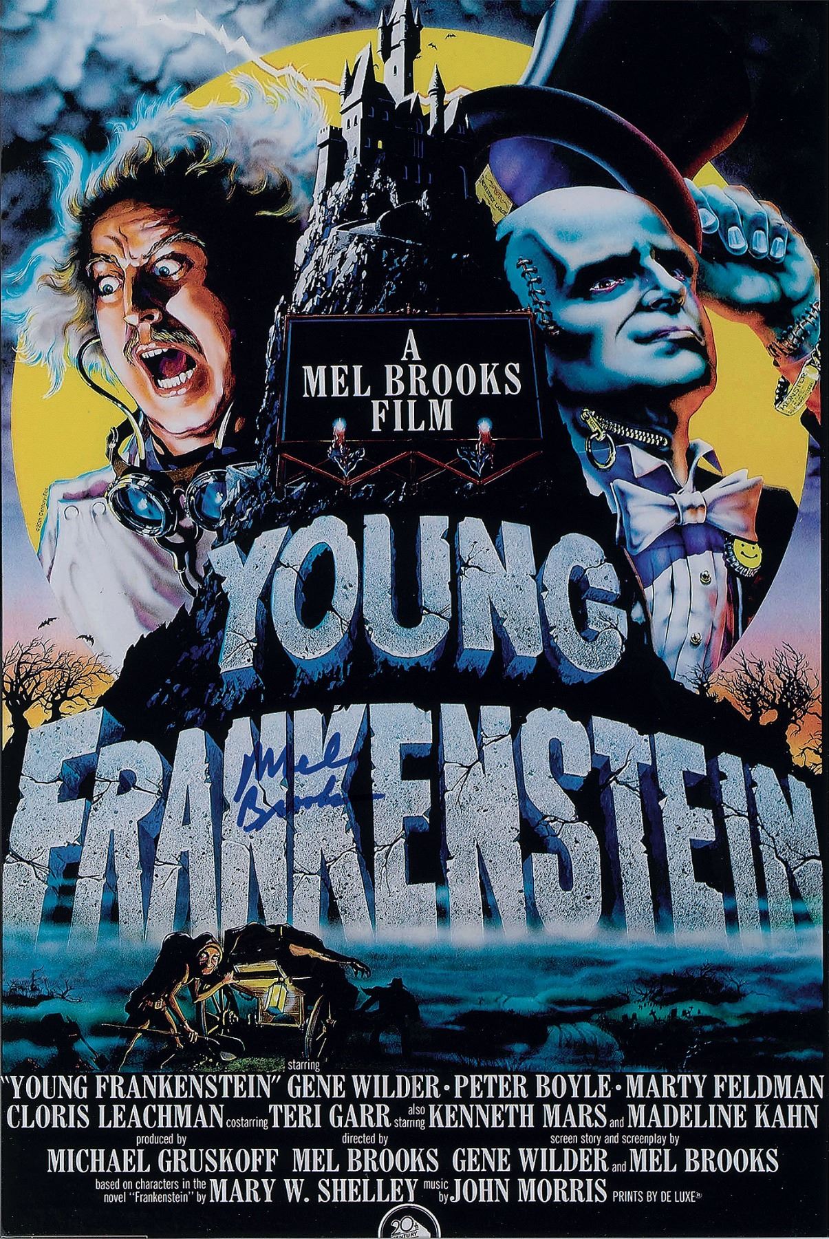 Two color satin-finish 12 x 18 photos, one showing the poster for the film Blazing Saddles, and the other the poster for Young Frankenstein, both signed in blue felt tip by Mel Brooks. In overall fine condition. Originally obtained by in-person specialist Mike Wehrmann.