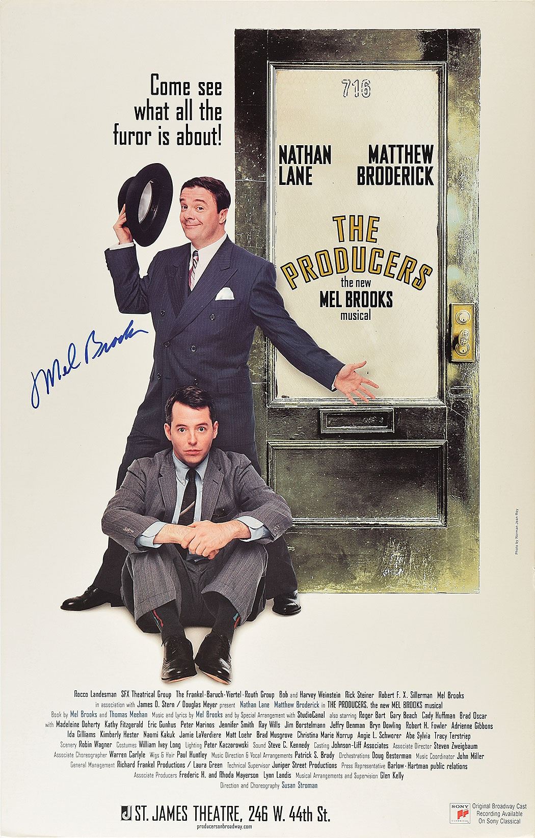 Appealing color 14 x 22 cardstock poster for the Tony Award-winning musical The Producers, depicting actors Nathan Lane and Matthew Broderick under the tag line, "Come see what all the furor is about!" Signed in blue felt tip by Mel Brooks. In fine condition. Originally obtained by in-person specialist Mike Wehrmann.