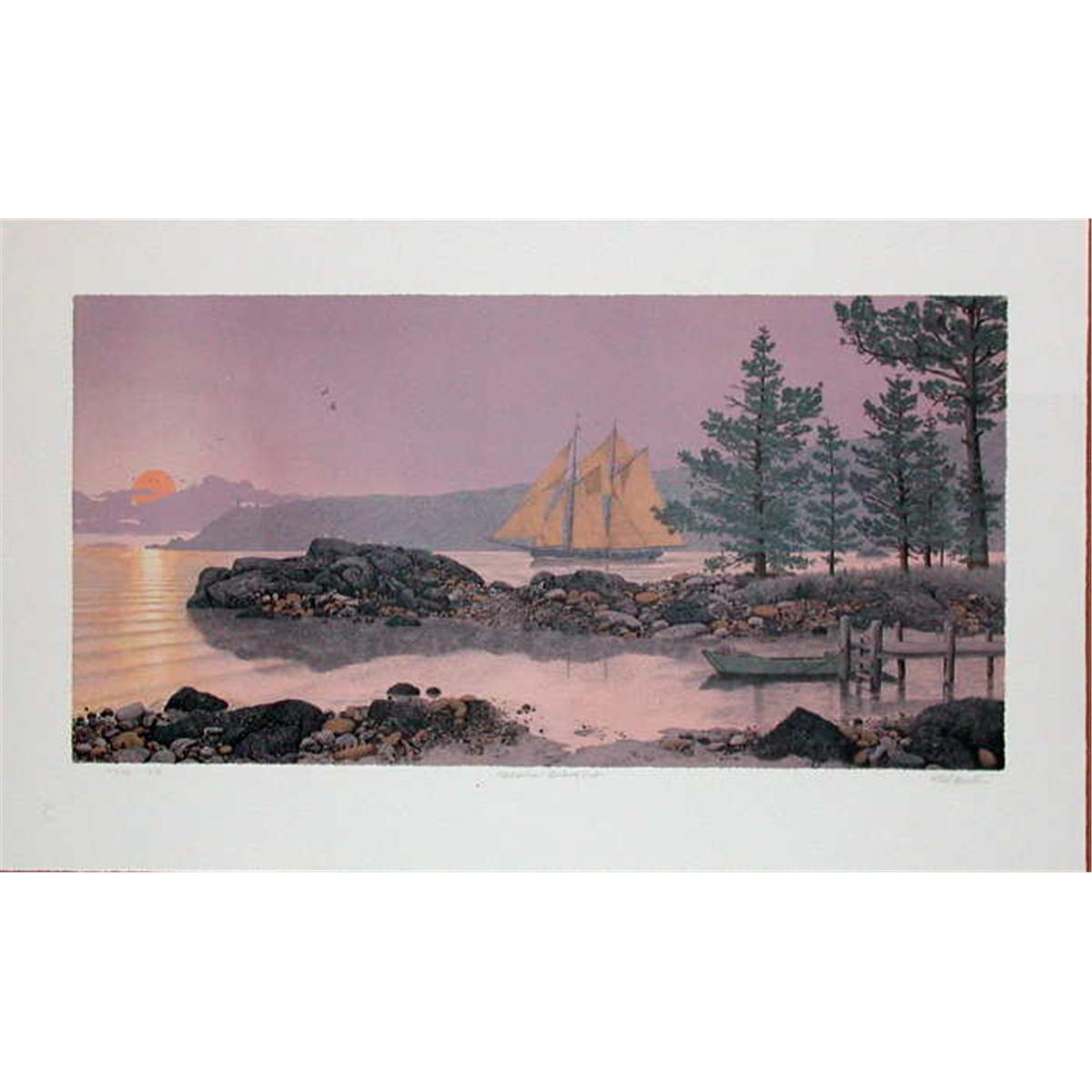 Hand drawn, stone lithograph of the tall ship Columbia released in 1973. 21x35 inches, signed in pencil and numbered 157/350. Domestic shipping-$20, International depends upon location. Mel Hunter was born in Oak Park, Illinois and grew up in the mid-west of the thirties. In 1953, he talked his way into his first paid job as an artist-illustrator at the top of the pay scale at Northrop Aircraft. For nine months, he painted astronomically correct starry backgrounds for the Snark missile program by day and paintings of imaginative expeditions to Mars and other far off places by night. In nine months, enough of these nocturnal flights of artistic fancy were selling to the booming Science Fiction magazines of the period to form the basis for free-lance freedom. From that day until August 1967, Mel Hunter turned out many hundreds of major science and technology related paintings for Life, Newsweek, Time-Life Books, National Geographic, Encyclopedia Americana, North American Aviation, Douglas, Convair, USAF, NASA and many others. During this period, he became perhaps the main painter of subjects relating to science and the budding space exploration program. At the peak of his career in 1967, he came to the realization that emphasis on science and technology had grown out of all proportion to the thought devoted to the rest of our daily lives and to the needs of the environment. Nobody in the art world, except for Andrew Wyeth, was speaking for our shrinking rural countryside, our diminishing clean air and water, and vanishing wildlife. So he came to Vermont to draw and paint the land and its wildlife and to write and illustrate books for children on what nature and the Earth are really all about. In the ensuing five years, his paintings and drawings have sold to many collectors. More than two hundred original watercolors and oils of birds have sold through the galleries of Abercrombie & Fitch in New York and the Massachusetts Audubon Society. Mel Hunter passed away in 2004.