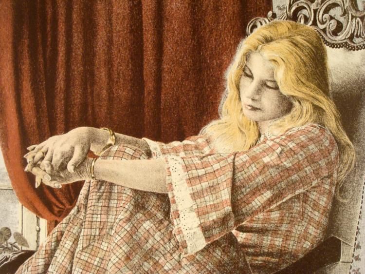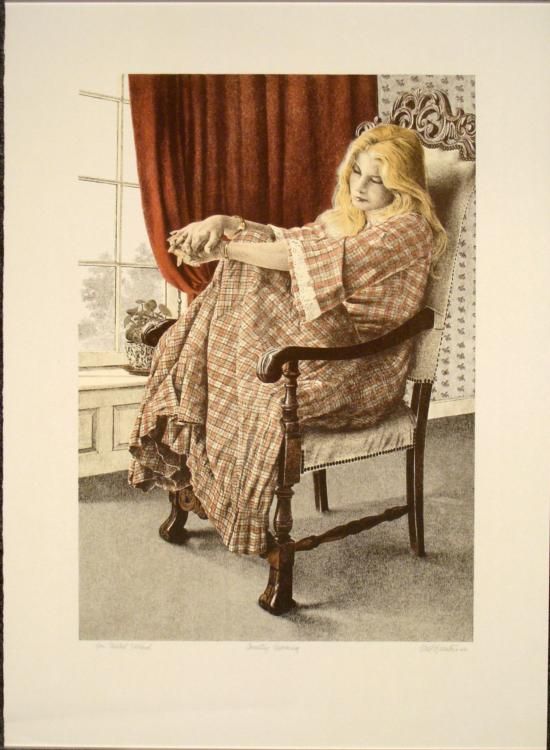 This portait portays an alluring strawberry-blonde lady, in morning meditation. Artist: Mel HunterCondition: ExcellentMedium: Print on paperSize: 19" x 26 1/2"Dedication: "Michel Tubard"Date: 1976BiographyPrior to making fine art prints, Hunter illustrated science books while living in New York City. During the summer of 1967, he relocated to southern Vermont, where he established his home and studio in a farmhouse high on a forested hill. At that point, he began depicting the land, animals, birds and changing seasons of his rural, semi-wild environment