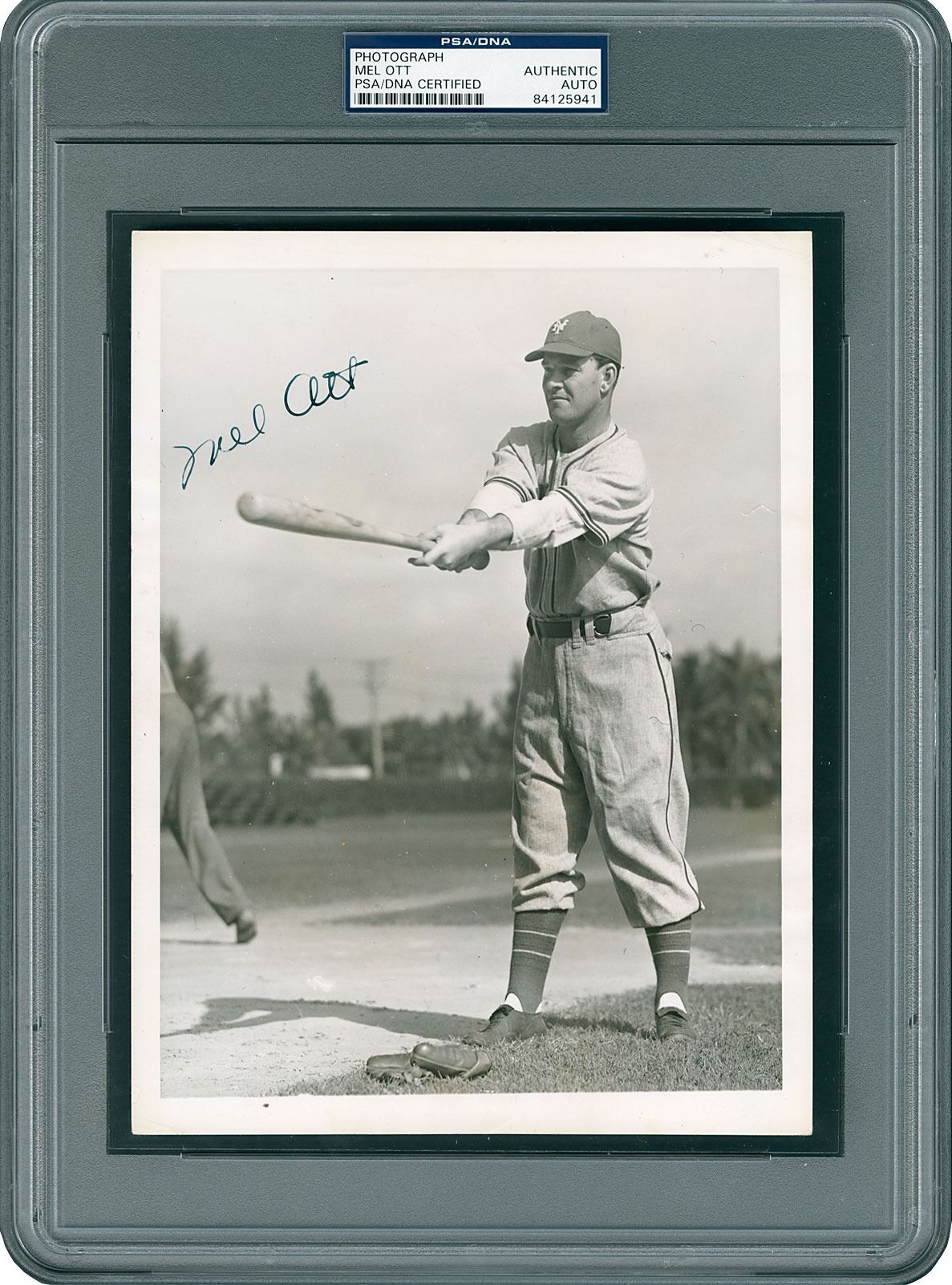 Crystal-clear glossy 7 x 9 photo of Ott wielding a bat during spring training in 1942, his first year as player-manager for the New York Giants, neatly signed in fountain pen. Reverse bears an affixed Associated Press caption dated February 17, 1942, and an ink stamp from "The News Library." In fine condition. Encapsulated in a PSA/DNA authentication holder.