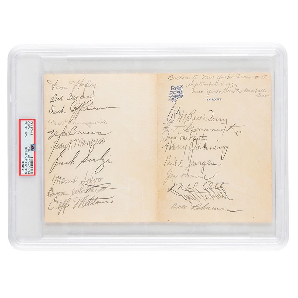 Vintage pencil signatures of the 1939 New York Giants baseball team on an off-white 10.75 x 7 sheet of New York, New Haven and Hartford Railroad stationery, including: Mel Ott, Carl Hubbell, Bill Terry, Johnny McCarthy, Henry Danning, Bill Jurges, Jo-Jo Moore, Bill Lohrman, Tom Hafey, Bob Seeds, Dick Coffman, Alex Kampouris, Zeke Bonura, Frank Mancuso, Frank Scalzi, Manuel Salvo, Burgess Whitehead, Cliff Melton, and Eddie Brannick. A collector's notation indicates that the page was signed en route from Boston to New York on September 8, 1939. In fine condition. Encapsulated in a PSA/DNA authentication holder.