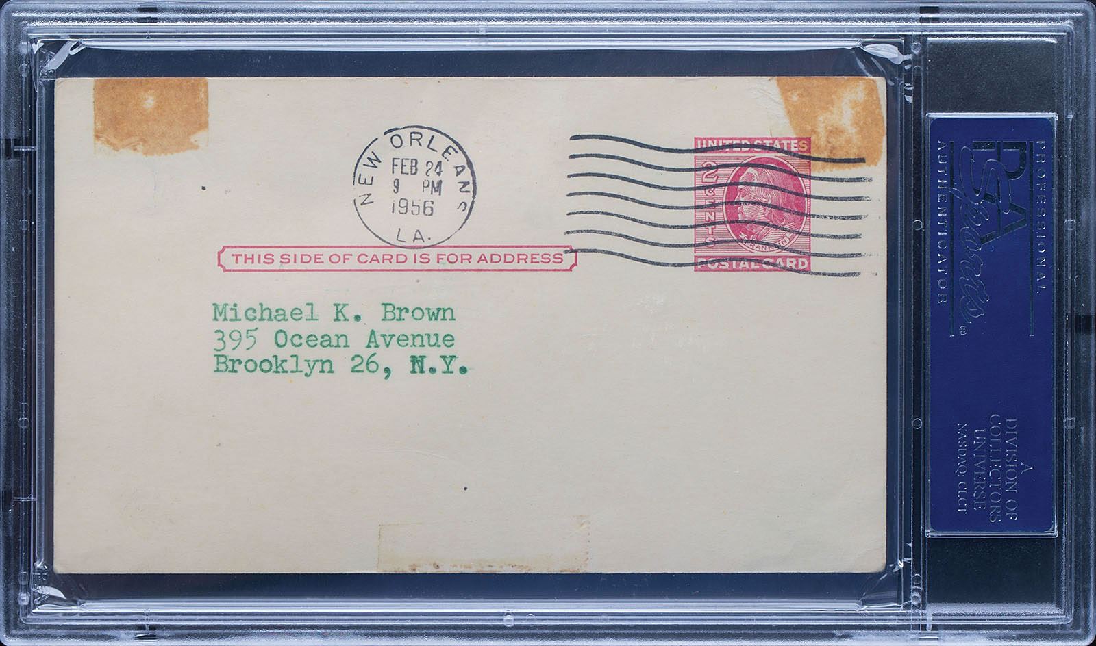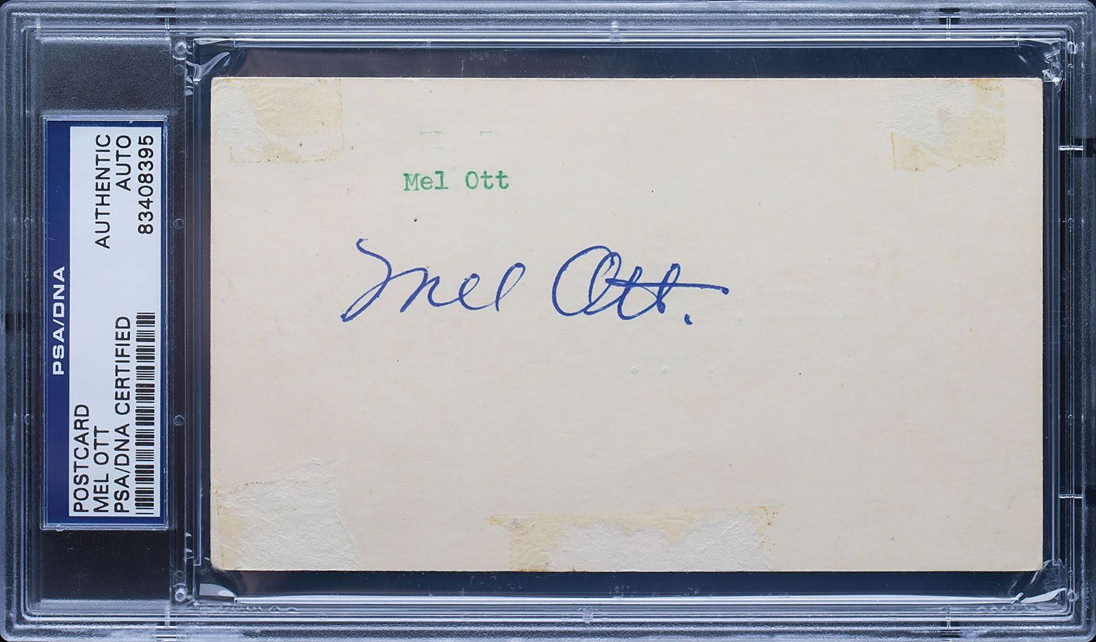 Bold ink signature, "Mel Ott,” on a 5.5 x 3.25 government postcard, postmarked February 24, 1956. Encapsulated in a plastic PSA/DNA authentication holder. In fine condition, with old tape stains to the margins, far from the signature.