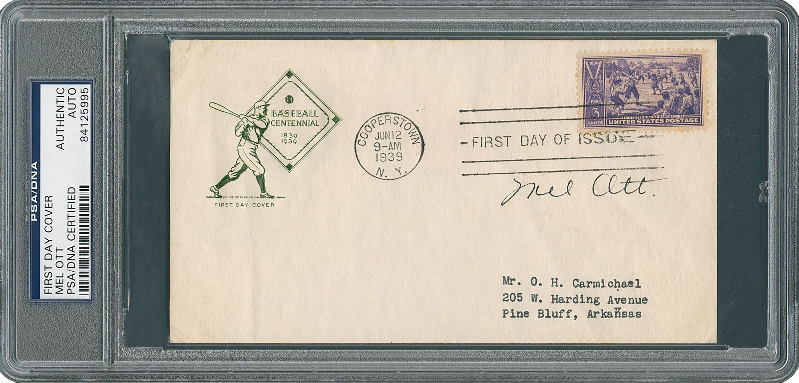 First day cover honoring the centennial of baseball, postmarked at Cooperstown on June 12, 1939, signed in fountain pen, "Mel Ott." Encapsulated in a PSA/DNA authentication holder. In fine condition. This three-cent postage stamp honoring baseball's 100th anniversary was issued in conjunction with the dedication and opening of the National Baseball Hall of Fame in Cooperstown, New York, on June 12, 1939. Famed for his high leg kick and extreme left-handed power, Ott became the first National Leaguer to surpass 500 home runs and was inducted into the Hall of Fame in 1951.