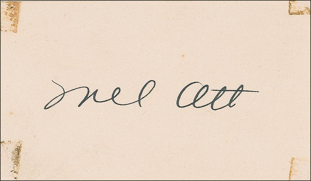 Vintage ink signature, “Mel Ott,” on an off-white 3.5 x 2 card. In fine condition, with small tape toning to each corner, all of which could be matted out.