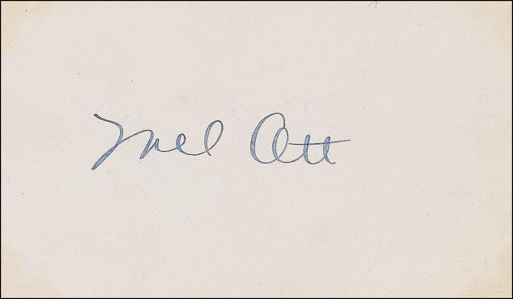 Vintage fountain pen signature, “Mel Ott,” on an off-white 4 x 2.25 card. In fine condition, with a bit of soiling and light toning at the four corners from past mounting. Accompanied by an unsigned photo of Ott in his New York Giants uniform.