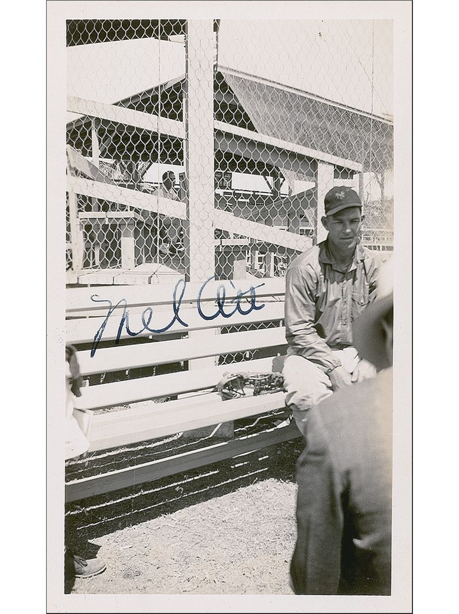 Vintage glossy 2.5 x 4.5 candid photo of Ott taking a break from practice, signed in fountain pen. In fine condition, with a few trivial creases.