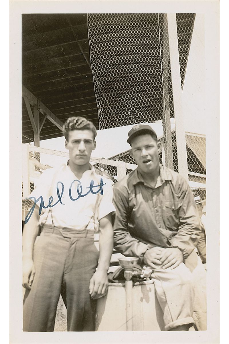 Scarce vintage glossy 2.75 x 4.5 snapshot photo of Ott relaxing while wearing his Giants hat, signed in fountain pen. In fine condition.