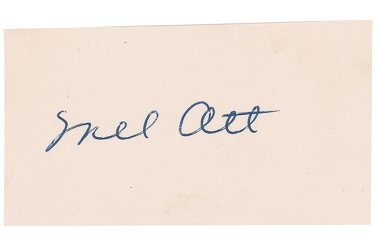 Superlative and highly desirable ballpoint signature, “Mel Ott,” on an off-white 3 x 1.75 card. In very fine condition. Accompanied by a pair of modern glossy photos.