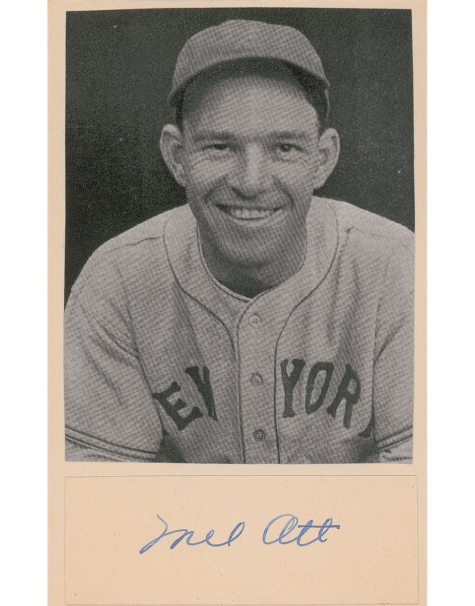 Blue fountain pen signature, “Mel Ott,” on an off-white 3.25 x 1.25 clipped card affixed to a larger 3.75 x 6 card bearing an affixed image of Ott. In fine condition.