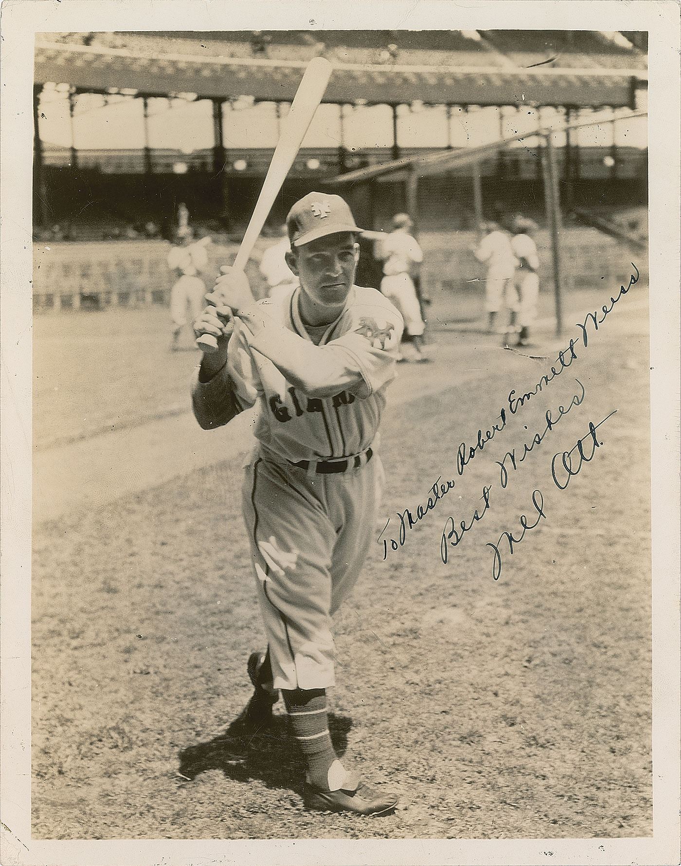 Vintage glossy 8 x 10.25 full-length photo of Ott posing in his New York Giants uniform, signed and inscribed in fountain pen, "To Master Robert Emmett Weiss, Best Wishes, Mel Ott.” In very good condition, with a tack hole to the top border, and moderate scattered overall creasing.